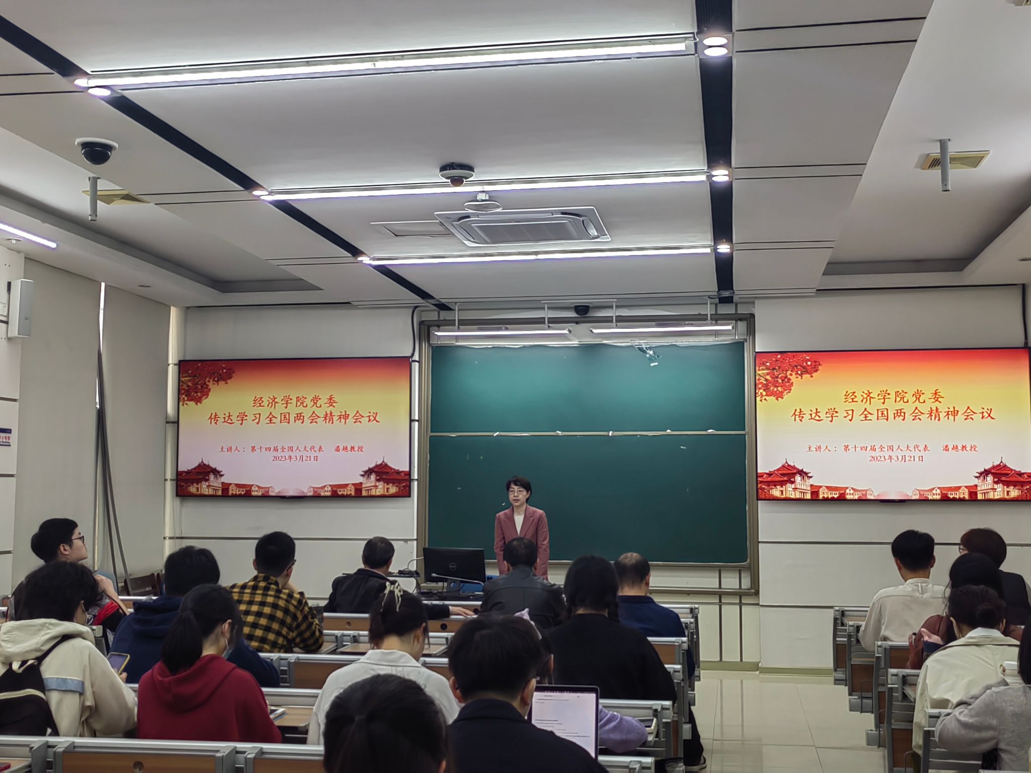 2023321日下午,太阳成集团tyc7111cc党委传达学习全国两会精神会议在经济楼D136举行,第十四届全国人大代表、太阳成集团tyc7111cc金融系教授潘越向学院党委理论学习中心组成员、师生党支部书记和师生代表传达全国两会精神。会议由学院党委书记黄鸿德主持。