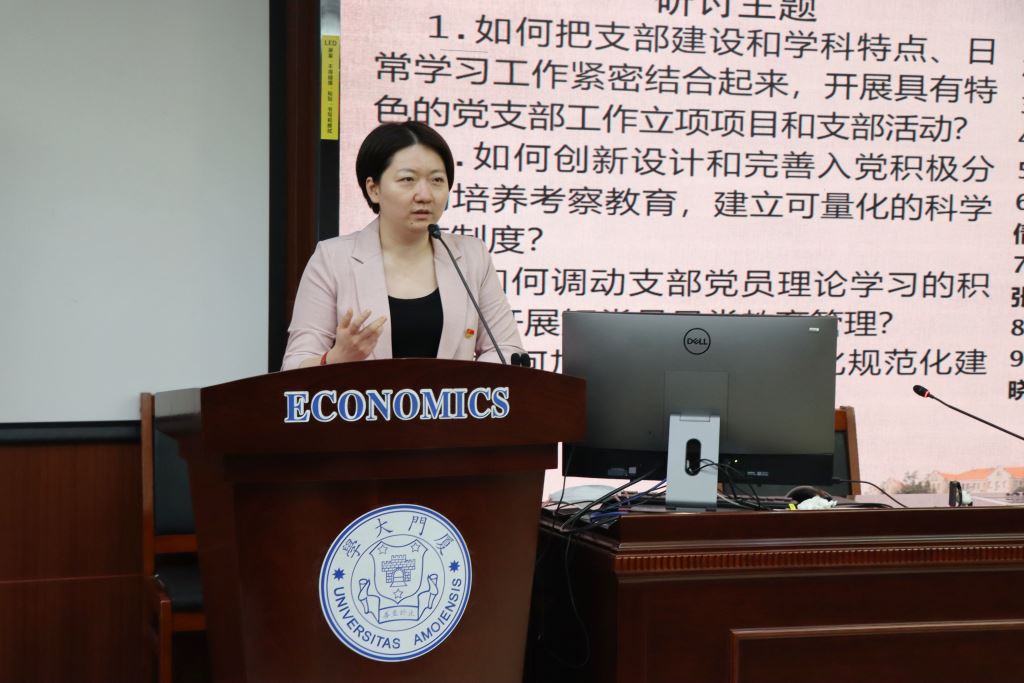 随后,3位学生党支部书记分别围绕支部日常管理、支部特色活动策划和党建活动新闻稿撰写等主题开展交流。经济学科2020级博士生党支部书记赵海以“注重激励与平衡:打造团结有力的党支部”为题,分享了支部在入党积极分子培养、支部管理等方面的经验,展示了如何构建支部入党积极分子动态培养考核体系。金融系2019级硕士生第一党支部书记耿玉刚用丰富的案例生动说明了如何写好活动请示、怎样调动支部成员积极性以及如何做好宣传工作,为支部开展好特色活动“传经送宝”。宣传工作是党建工作的喉舌、利剑,生动凝练和宣传学生党建工作,对推动学生党建工作高质量开展具有重要意义。经济学系2020级硕士生党支部书记王艺在分享中结合丰富案例和自身实践,细致讲解了学生党建活动新闻稿的标题、首段、主体、结尾四个部分的写作思路,强调撰写党建新闻要提高政治站位,苦练写作内功。