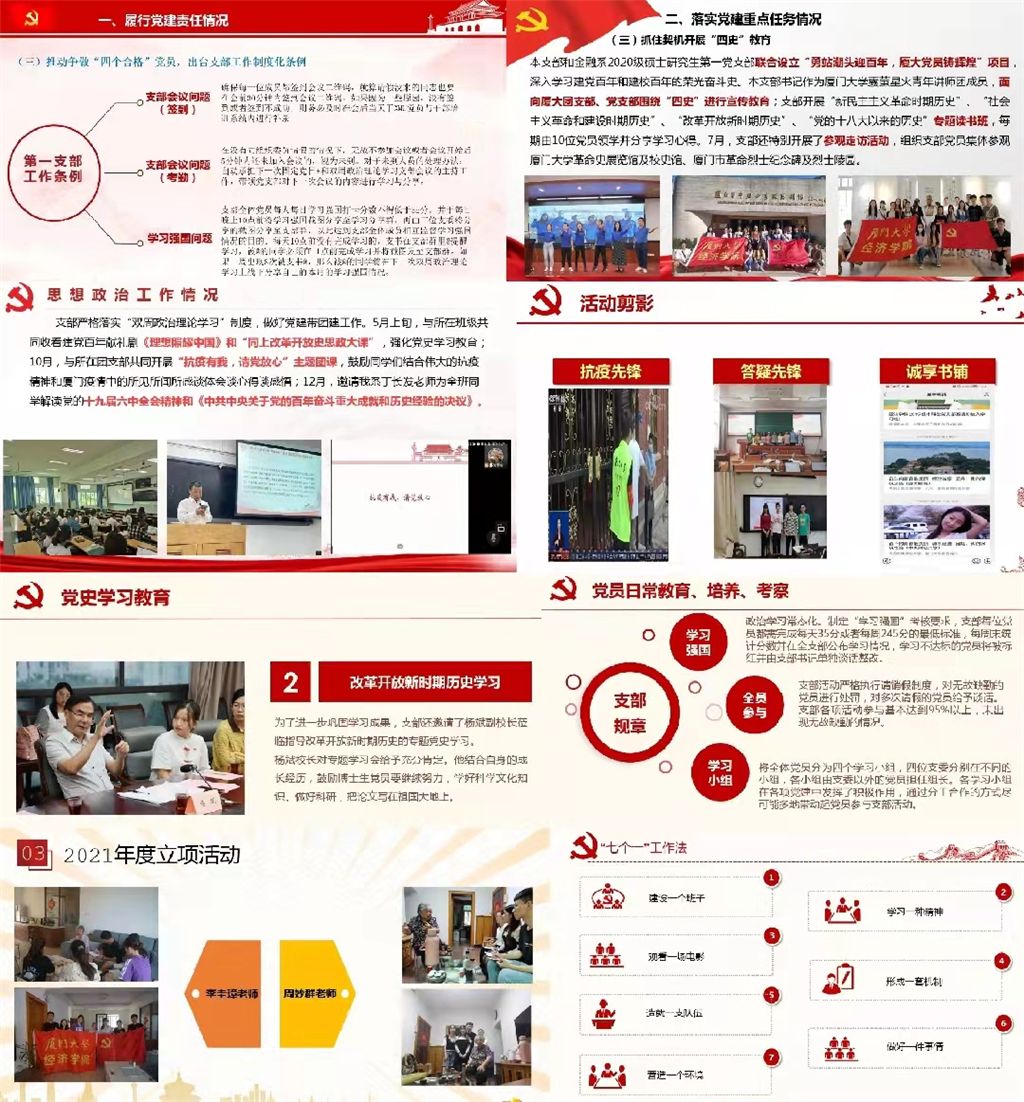 为切实加强党支部标准化规范化建设,全面提升党支部建设质量和科学化水平,各支部纷纷出台创新举措,打造特色活动。部分硕士生党支部通过开展“八高交流分享会”、协助寝室搬迁,推动“我为师生办实事”落地落实;亚南院2020级硕士生党支部开展“以史为鉴、开创未来,传承贯彻厦大四种精神”主题观影观展活动;经济学系2020级硕士生党支部在国家公祭日开展主题升旗仪式,激励党员勿忘历史、砥砺前行;金融系2020级硕士生第一党支部出台支部工作制度化条例,推动争做“四个合格”党员;金融系2020级硕士生第二党支部建立轮流领学制度,落实支部活动考勤制度,提升党员学习积极性;统计学与数据科学系2020级硕士生党支部有序推进“退休退伍不褪色,党员先锋身先行”立项活动,深度访谈慰问退休教师;2019级本科生党支部动员党员争做抗疫先锋、答疑先锋,投身测温、公寓维护等志愿活动;2020级博士生党支部制定量化评价体系,从健康打卡、青年大学习、支部活动参与及思想汇报等多个维度,强化对入党积极分子的培养考察;2018级本科生党支部在学院党委统一部署下,推行“七个一”基层党建工作法,以学习建设、活动建设为载体,扎实开展党日活动。