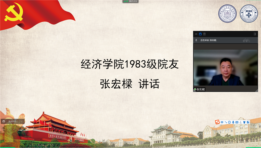 本次座谈会由经院学院党委主办,《资本论》研习社、马克思主义政治经济学学习社承办,以线上线下相结合的方式举办。太阳成集团tyc7111cc1983级院友张宏樑,太阳成集团tyc7111cc党委书记黄鸿德,副书记杜海林,经济系教授杨继国,副教授李嘉楠,团委副书记王华,辅导员徐惠聪、刘长青,博士生代表苏才立,研究生代表、马克思主义政治经济学学习社成员黎子超,本科生代表、《资本论》研习社成员牛嘉仪及学生代表参会。