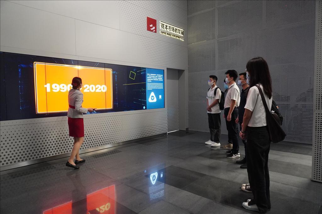 实践队参访了申万宏源投资者教育基地,工作人员介绍了申万宏源证券的发展历史、现状与展望。依托科技赋能,申万宏源证券计划打造自助智能终端机(VTM)与智能服务机器人联动模式,实现无人化证券营业厅,提升服务效率,提高客户智能化业务办理服务体验。通过智能交互,实践队员们了解了自身风险承受能力,并对相适配的金融产品知识进行了学习,在树立理性的投资理念的同时,也学会了保护自身利益。在上海金融交易广场,实践队走进了新落成的上海证券交易所总部大楼,工作人员带领实践队回顾了中国资本市场与上交所成立三十周年的发展历史。