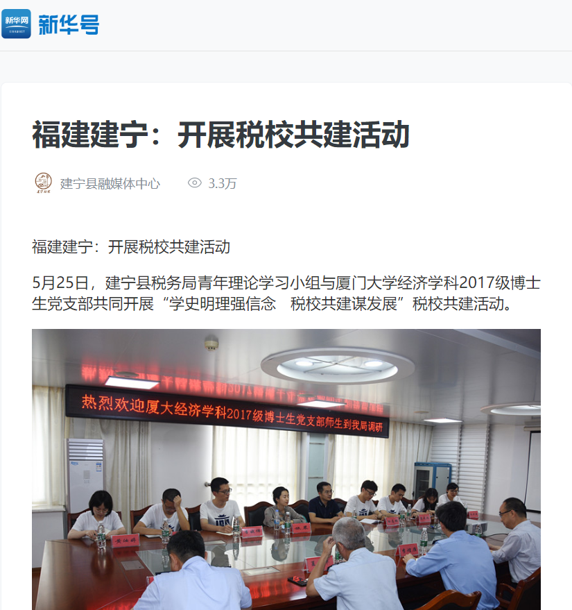 最后,“博学经世”博士团队长冷志鹏还专门为建宁县税务局做了一场如何从税收角度提高城市营商环境的报告,报告内容受到了建宁县税务局的肯定会上,实践队还与建宁县税务局工作人员展开积极的讨论,大家纷纷表示税校共建新模式能使双方在理论学习和实践实操方面都获益匪浅。此行,被“新华网”融媒体平台广泛报道,题为《福建建宁:开展税校共建》的新闻报道已有3.4万的阅读量,影响较为深远。
