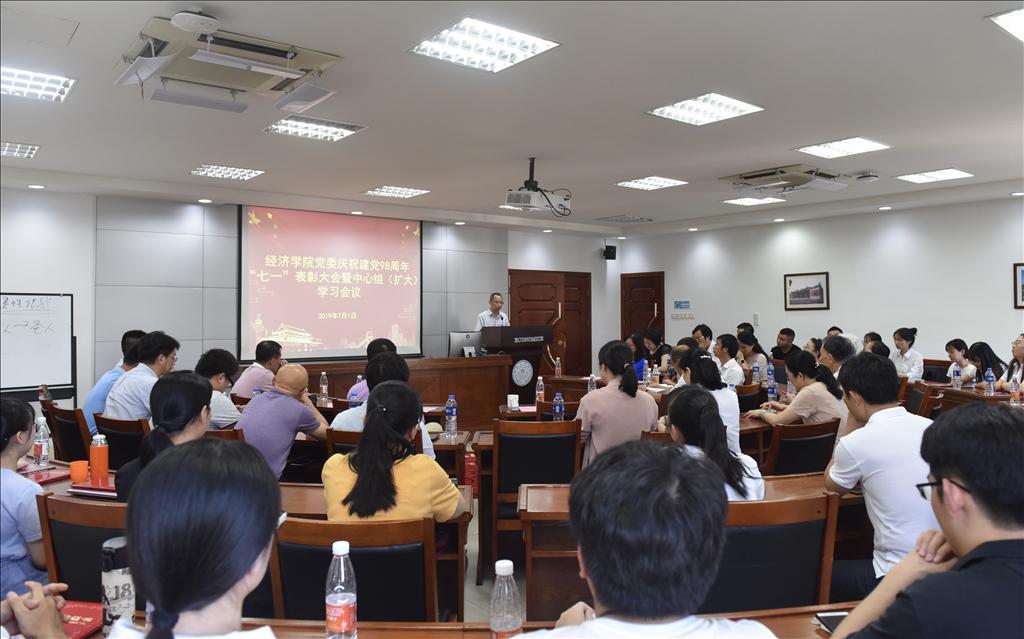 院党委书记黄鸿德代表学院党委向受表彰的先进集体和个人表示热烈的祝贺,向辛勤工作在教学、科研、管理、服务等一线的教职工党员、关心支持学院发展的离退休党员和勤奋学习的学生党员致以节日的问候。他简要回顾了中国共产党成立98年以来取得的光辉成就,并指出我们党能发展为拥有9000多万名党员的世界第一大执政党,主要原因在于不管是处于顺境还是逆境,始终坚守为中国人民谋幸福、为中华民族谋复兴的初心和使命。他希望受表彰的党支部和党员同志们不忘初心、牢记使命,珍惜荣誉,再创佳绩,并对全院党支部和党员同志们提出了三点希望:一是全面提升党支部组织力,强化党支部政治功能,推动落实“七个有力”,为经济学科“双一流”建设提供坚强的政治保障和组织保障;二是进一步强化创新理论武装,引导党员在“不忘初心、牢记使命”主题教育中补足精神之“钙”、筑牢信念之“魂”,用实际行动践行“四个合格”;三是向受表彰的先进集体和个人学习,充分发挥党支部的战斗堡垒作用和党员的先锋模范作用,以昂扬向上的精神风貌和求真务实的工作态度,为建设中国特色世界一流的经济学科、实现学校“两个一百年”奋斗目标贡献应有之力。