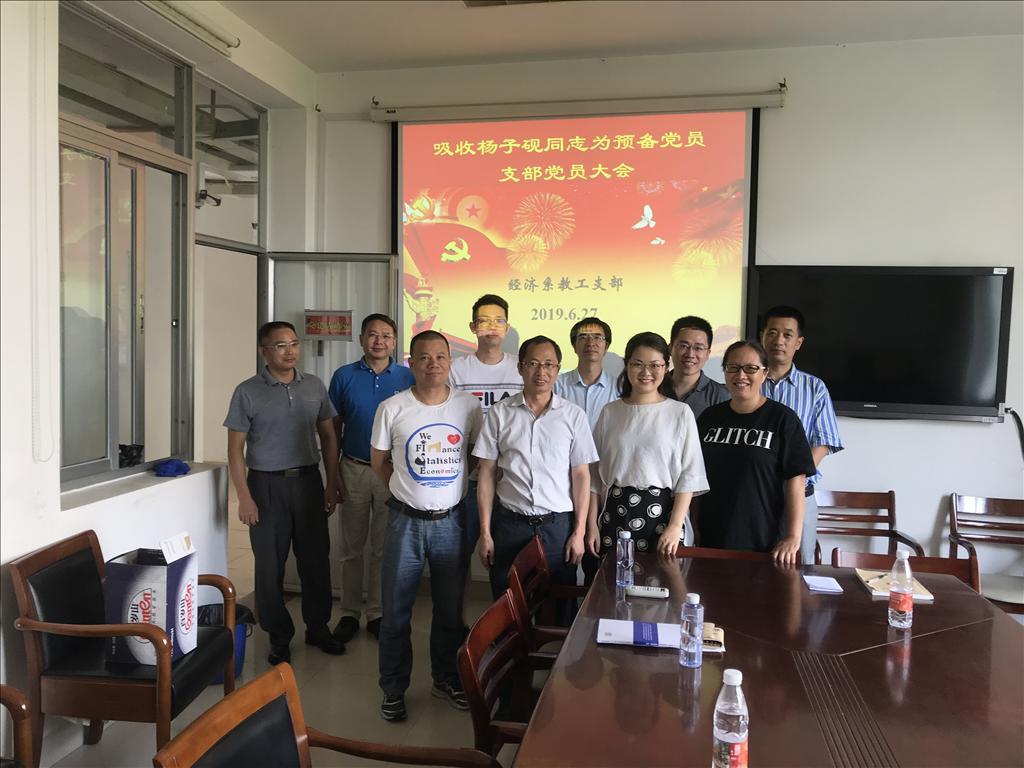 6月27日下午,经济学系教工党支部在经济楼A417召开发展党员大会,讨论接收杨子砚同志为中共预备党员事宜。院党委书记黄鸿德、经济学系教工支部正式党员及发展对象杨子砚参加了会议。会议由党支部书记张兴祥主持。