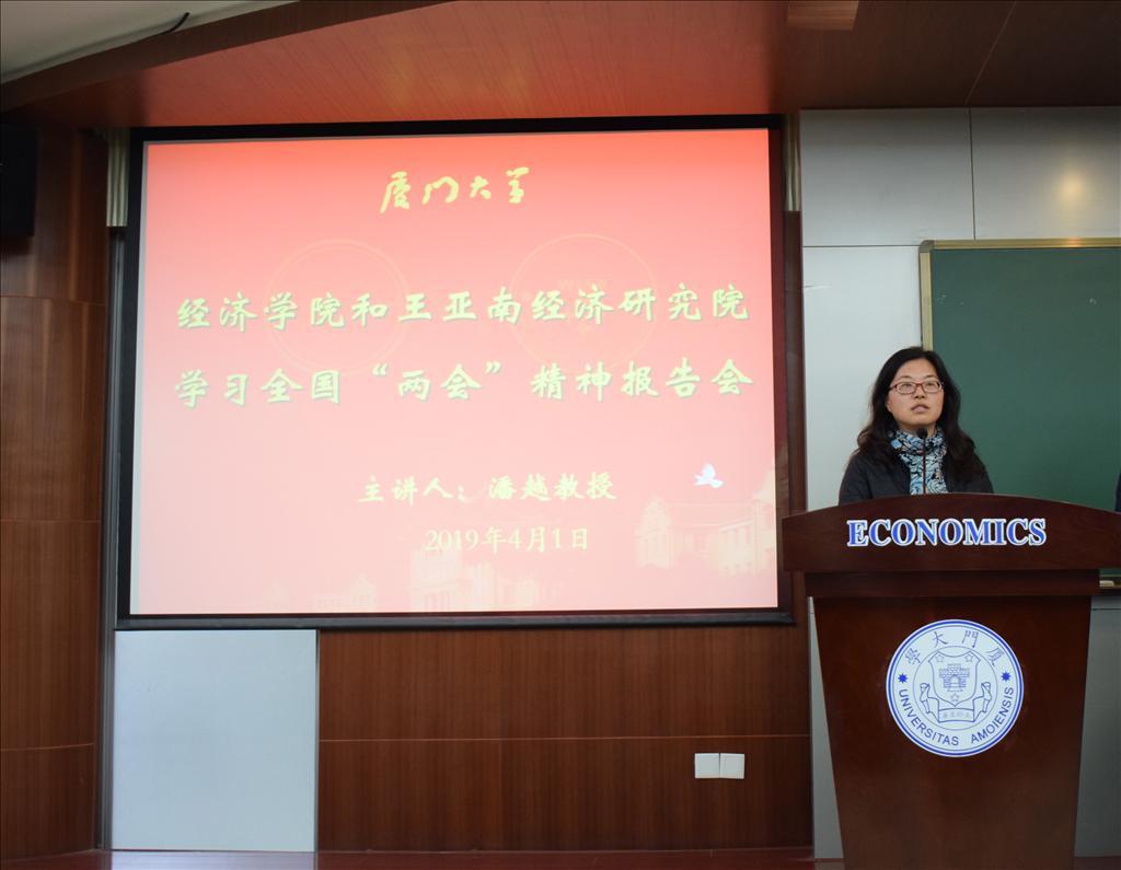 4月1日下午,太阳成集团tyc7111cc和王亚南经济研究院(以下简称“两院”)传达学习十三届全国人大二次会议精神报告会在经济楼N303举行,十三届全国人大代表、太阳成集团tyc7111cc金融系教授、博士生导师潘越向两院师生代表传达了十三届全国人大二次会议的基本情况和主要精神。学院党委理论学习中心组成员、教职工代表、学生党支部书记和支委、学生代表等参加报告会。报告会由学院党委副书记周蕾主持。