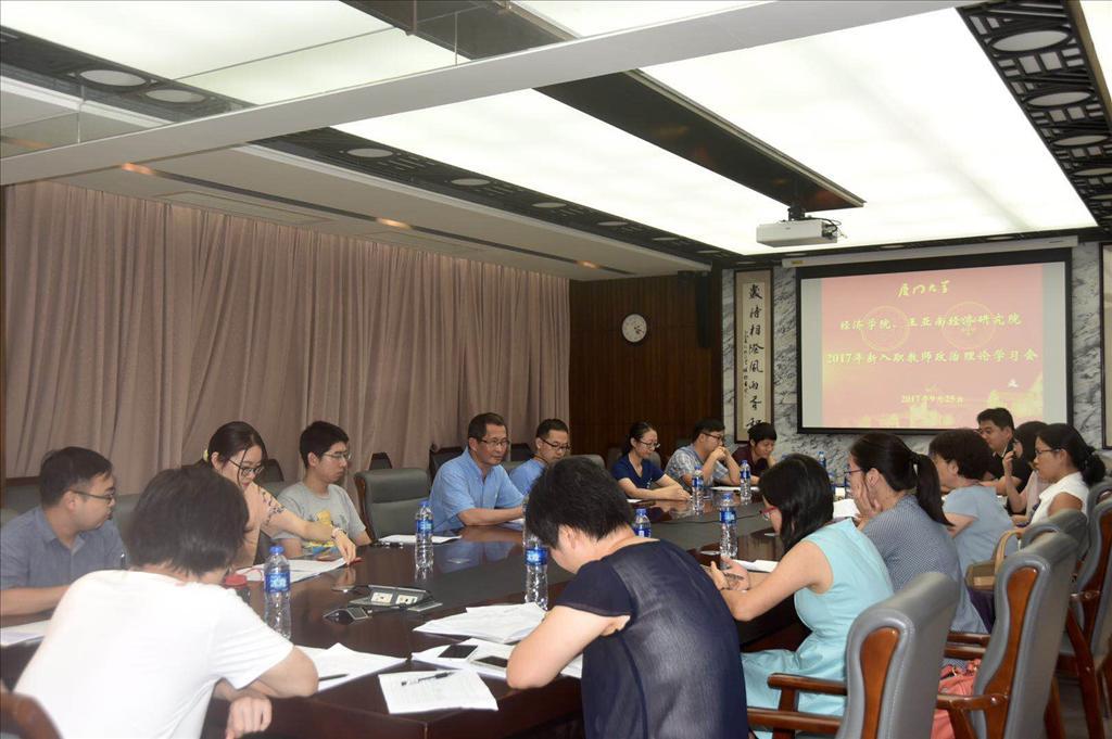 学院党委统一组织两院2017年新入职的专任教师在经济楼N501召开政治理论学习会,学习会由党委书记雷根强主持。他带领新老师们一起学习了全国高校思想政治工作会议精神和习近平总书记在哲学社会科学工作座谈会上的讲话精神,与会老师相互交流了学习体会,纷纷表示:作为社会科学工作者,要自觉坚持以马克思主义为指导,立足中国、借鉴国外,为构建中国特色哲学社会科学做出自己的贡献;作为教师,要更好担起学生健康成长指导者和引路人的责任,任重道远,必须坚持以德立身、以德立学、以德施教。