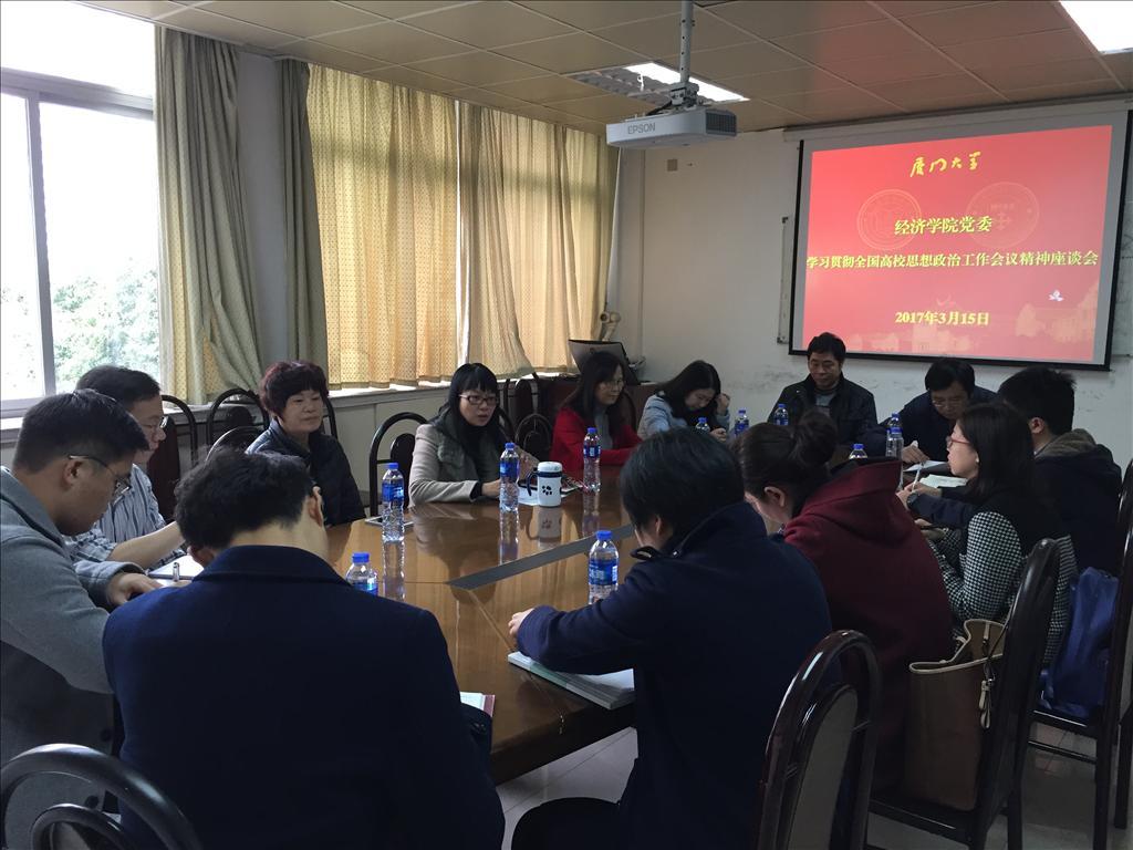 与会人员结合自身的工作、学习实际,围绕全国高校思想政治工作会议精神进行交流讨论。国际经济与贸易系林丽清老师认为,高等学校教育工作者必须牢牢抓好高校阵地,在一线工作的教师必须加强学生的思想政治教育,提高学生辨别是非的能力。经济学系刘连支老师提到,思想政治理论课要与时俱进,根据发展大势,形势与政策可以有机结合到课堂中,通过教师生动形象的传授,使得思政课更加有亲和力。财政系刘晔老师提出,思想政治教育工作不仅仅是辅导员等政工队伍的工作,也是全体专业老师的职责所在,专业老师在第一课堂的教学过程中要加强思想政治教育意识,与辅导员共同解决学生的思想问题。要加强师德师风建设,引导广大教师以德立身、以德立学、以德施教。金融系黄娟娟老师认为,教师要注重言传身教,培养学生的责任感与使命感,要充分利用好课堂教学这个主渠道,满足学生成长发展的需求,形成协同效应,实现思政教育的最优化。海归教师许梦涵根据自身的学习经历,认为中国的历史、文化底蕴等先天优势是其他国家无法比拟的,高等教育工作者应该全面客观地认识当代中国、看待外部世界,鼓励学生要有理想、有远大抱负,要勤奋学习,激发学生成为有作为、充满正能量的青年。学院团委书记何丽苹认为,要更加注重以文化育人,以实践育人,广泛开展形式多样、健康向上的校园文化活动和各类社会实践活动,学院多年来坚持打造以台港澳学生为主体的社会实践队,深入祖国各地实践调研,切身感受改革开放以来祖国的繁荣发展,活动成效显著。学院关工委陈洁老师根据多年的工作体会,认为思想政治教育工作可以通过丰富多样的艺术活动形式来开展。她以我校“南强颂”音乐舞蹈史诗的展演为例,认为学生在参加高雅艺术活动过程中,能够从中深受教育。与会学生代表则从他们的角度出发,提出思想政治教育工作要以同学们喜闻乐见的活动形式开展,更多的将当前国际、国内形势政策宣讲结合进去,让同学们在潜移默化中接受教育,这样可以切实做到“入心入脑”。同时,要积极运用新媒体新技术,增强时代感和吸引力,让思政工作“活”起来。大家一致表示,作为高校师生,要全身心投入解决习近平总书记强调的“高校培养什么样的人、如何培养人以及为谁培养人”这个根本问题。