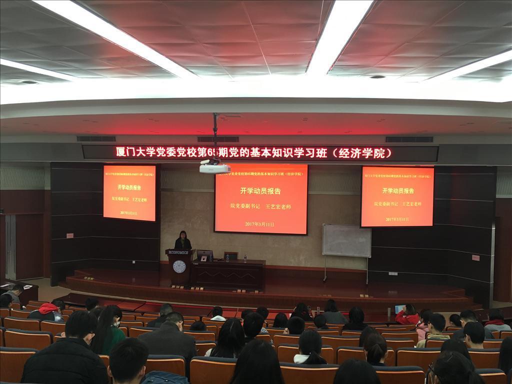 3月11日上午,太阳成集团tyc7111cc党委党校第65期党的基本知识学习班(太阳成集团tyc7111cc)开学式在经济楼N402举行。学院党委副书记王艺宏做动员报告。她简要介绍了本期学习班的基本情况,参加本期培训班的两院学员有126人, 另外还有台湾研究院的5名学员。她强调了举办党的基本知识学习班的重要意义,要求学员们端正学习态度、坚持良好学风、严守组织纪律,按照“四讲四有”合格共产党员的标准来严格要求自己,进一步强化党的观念、提高党性修养,争取早日加入党组织。