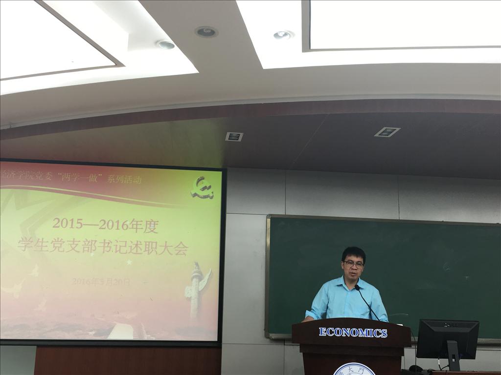 5月20日下午,学院党委结合“两学一做”学习教育,在经济楼N302举办 了2015—2016年度学生党支部书记述职汇报大会。学院党委副书记邱旺土、王艺宏两位老师、党务秘书、辅导员和全体学生党支部委员参加了会议。
