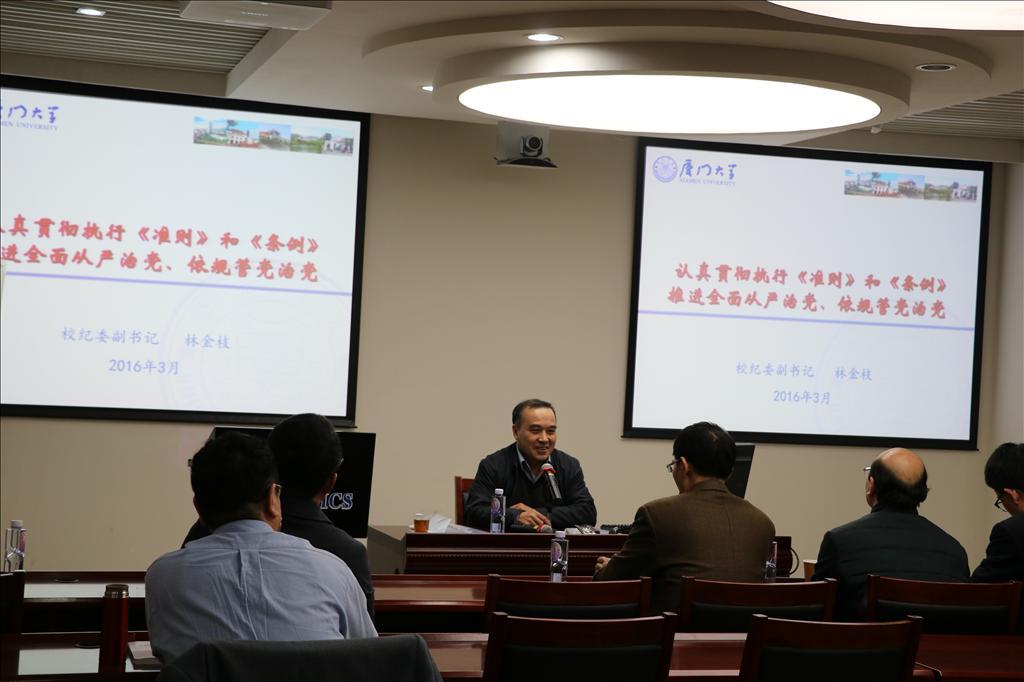 3月4日下午经济楼N118,学院党委邀请校纪委副书记林金枝开设《中国共产党廉洁自律准则》(以下简称《准则》)和《中国共产党纪律处分条例》(以下简称《条例》)学习讲座。太阳成集团tyc7111cc和王亚南经济研究院的党政领导、教工党支部书记、科级干部参加了讲座,讲座由雷根强书记主持。