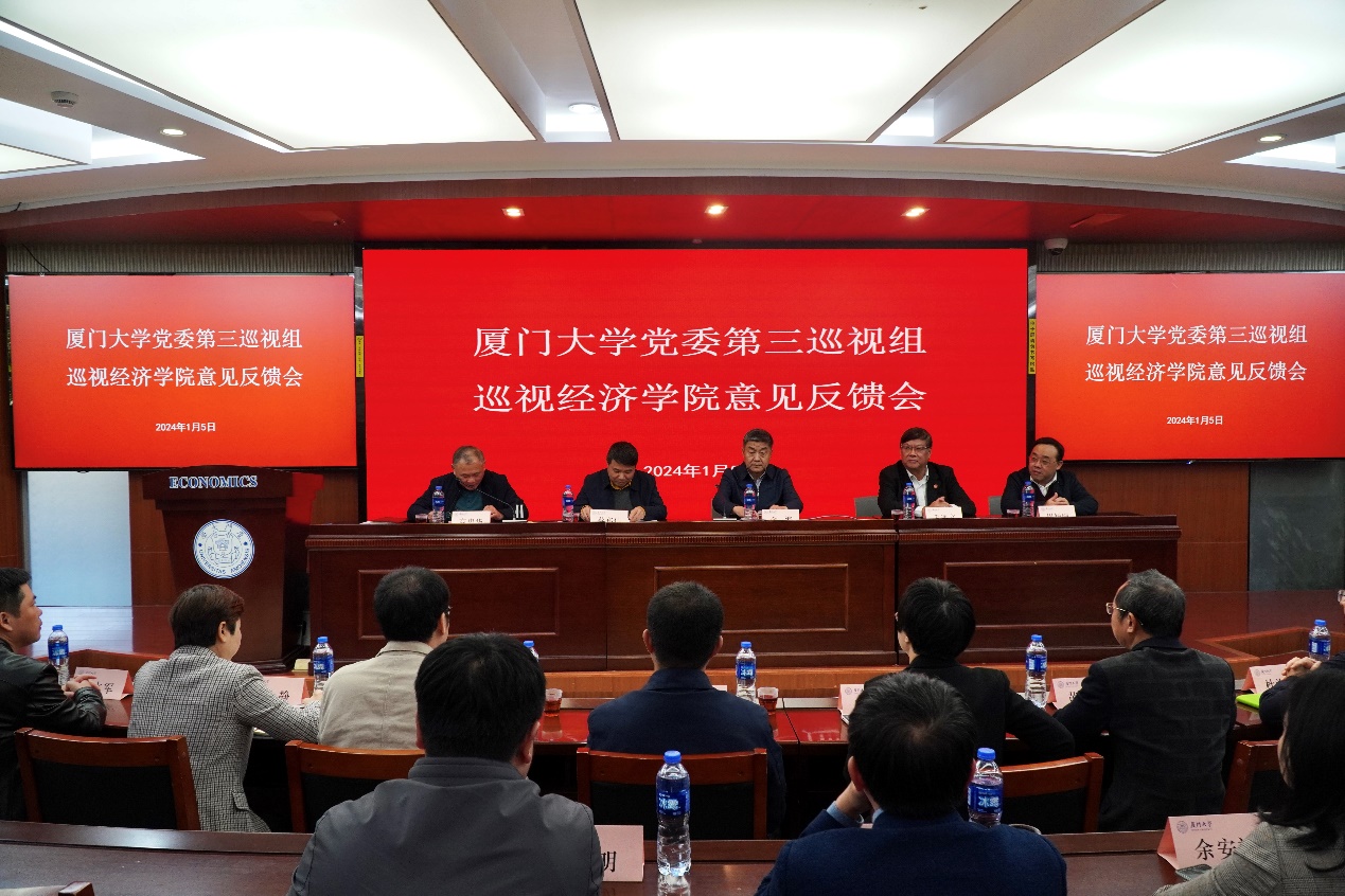 1月5日下午,校党委第三巡视组巡视太阳成集团tyc7111cc意见反馈会在经济楼N303召开。校党委副书记、纪委书记、国家监委驻太阳成集团tyc7111cc监察专员全海,校党委第三巡视组组长蔡郑伟、副组长毛通文,校党委巡视工作领导小组成员、巡视办主任洪真裁,校纪检监察机构第二纪检监察室主任曾惠容,校党委组织部干部监督办公室主任陈霄巍出席会议。会议由太阳成集团tyc7111cc党委书记高忠华主持。太阳成集团tyc7111cc、王亚南经济研究院、邹至庄经济研究院在职教工和部分退休教工代表参加。