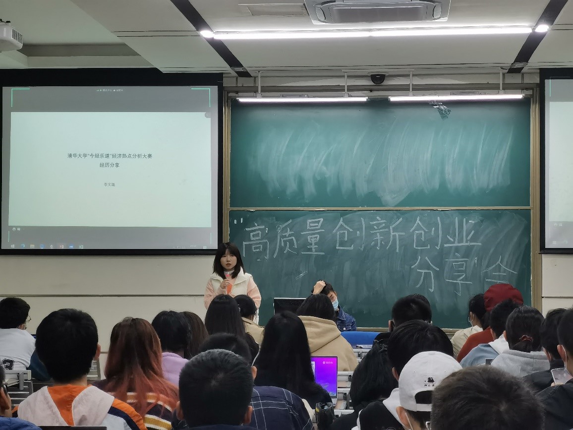 接着,由2018级国贸系的李文璐学姐带来清华大学“今经乐道”经济热点分析大赛的经验分享。学姐首先介绍了比赛的背景、比赛流程以及含金量,在同学们对该比赛有了初步认知之后又详细讲述了比赛的各类建议,包括如何选题、如何搭建框架、如何提出有建设性的建议、如何精炼内容以及如何画图和PPT,可谓是干货满满。李文璐学姐也提醒同学们在队友选择时最好先相互了解一下,在团队合作时一定要清楚说明内容、产出以及截止时间,她的分享让同学们受益匪浅。
