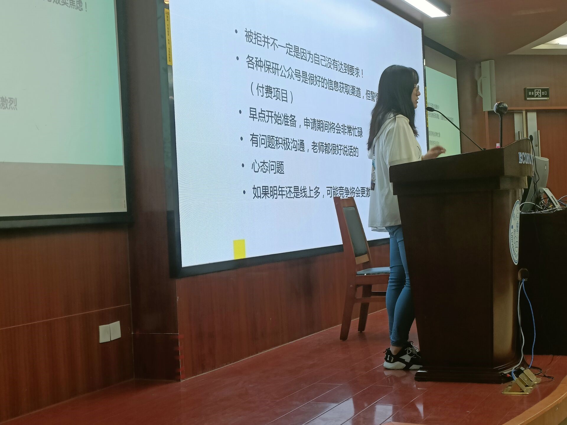 本次活动中最后一位进行分享的是国际商务系的羊学姐。在介绍完自己所投递的项目以及参营状况之后,羊学姐直奔发言重点,即介绍保研所需的条件及准备工作。羊学姐着重强调了保研考核中英语的重要性以及前往大厂实习的必要性。在这之后,羊学姐为听众科普了申请流程以及自己的一些建议。在分享的后半段,羊学姐以轻松的口吻与学弟学妹们谈论了自己保研过程中的心路历程,引发了听众们的对于人生重要阶段心态如何调整的思考,最后羊学姐建议同学们对自身情况进行综合考虑,找出一条属于自己的光明之路。