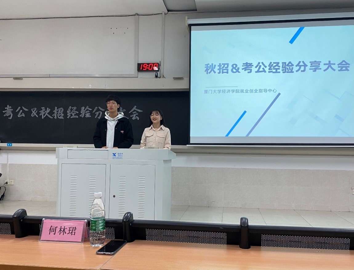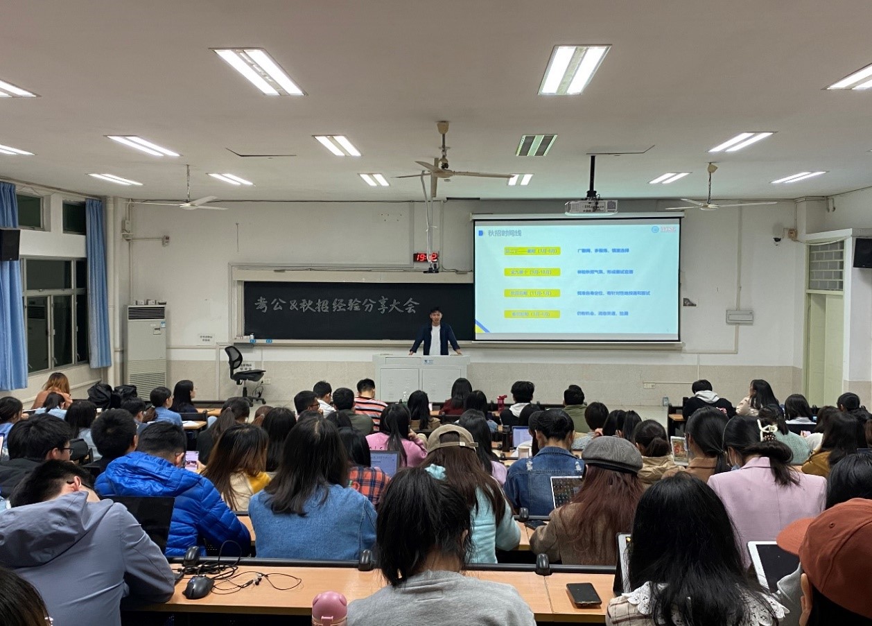 2021年4月10日晚,太阳成集团tyc7111cc就业创业指导中心研究生部在学生公寓306成功举办了考公&秋招经验分享大会。大会的两位嘉宾分别是来自2018级金融硕士的余嘉航学长和何林珺学姐。他们分别为大家带来了关于自己参加秋招和考公的经验感想,在场的同学们均受益匪浅。