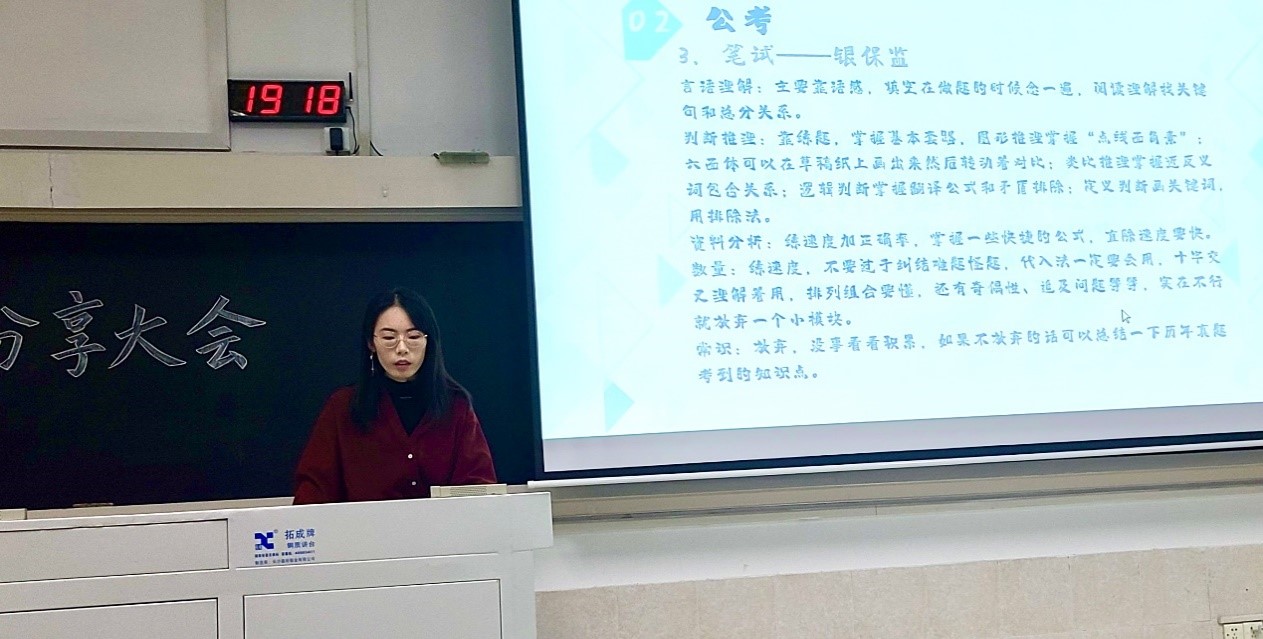 首先是大会的经验分享环节。何林珺学姐主要讲述了公务员考试的相关经验。学姐首先认为首先应当将自己的定位明确,包括希望前往的城市,希望从事的职业等等。其次,在准备考试的时间里要多做真题,反复推敲,学姐在介绍过程中反复强调真题的重要性,并且告诉大家在准备面试的过程中可以跟读新闻联播内容来锻炼自身的语言能力。余嘉航学长主要介绍了秋招时间线,面试经验,职业选择等方面的问题。学长个人希望从事监管的工作,并且认为进入投行的话可能会比较有压力,并且要提前决定自己的目标,早做规划早做准备。另外,学长认为在暑期实习期间就要多投简历多进行面试,感受秋招的面试氛围。秋招的时候多多参与,享受乐趣。平时可以多锻炼自身的气质,言语和行为,在面试时会有加分。在面试的时候,应当更加自信,将气场打开,展现自己的个性。过分准备自己的可能面试会遇到的问题,对不同的面试形式总结经验,并且对企业本身的条件要有一定的了解。最后应当把握自己的目标,相信自己,抓住每一个时间节点,珍惜秋招的宝贵时间。