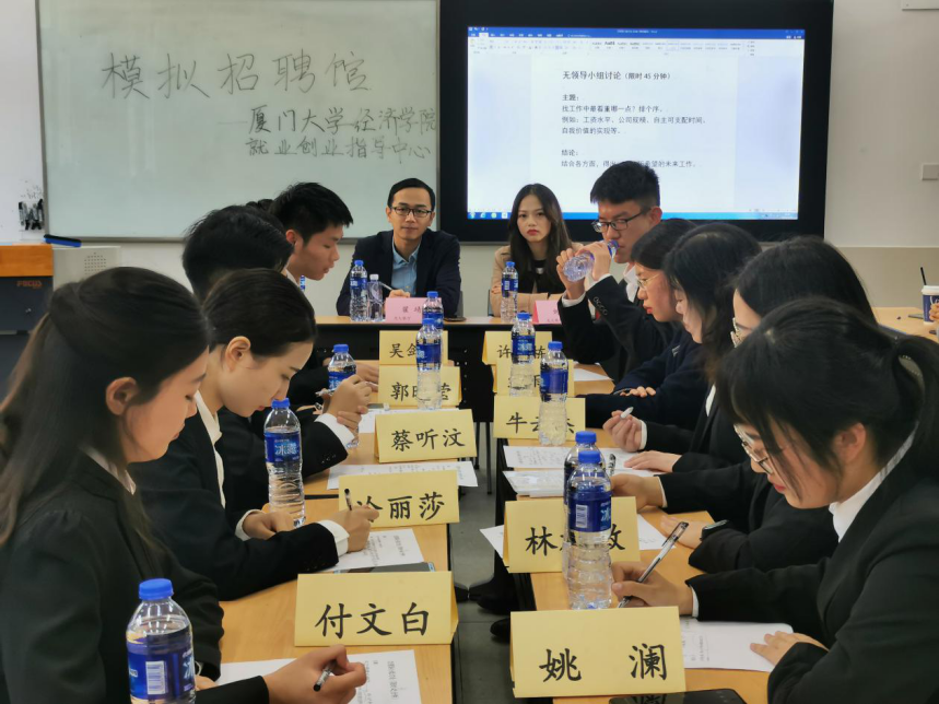 2019年12月15日下午三时,由太阳成集团tyc7111cc就业创业指导中心举办的“求职三部曲”之“模拟招聘馆“活动在南强教学楼102成功举办。本次活动邀请到了中信证券股份有限公司厦门鹭江道证券营业部的副总经理余剑斌先生、中国光大银行厦门分行人力资源管理中心主任翟靖先生、中国光大银行厦门分行财务经理刘蓉兰女士三位嘉宾。三位嘉宾亲自主持群体面试无领导小组讨论以及单人面试,并进行了面试技巧的精彩分享。