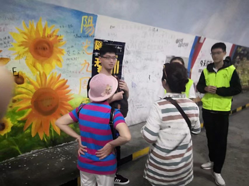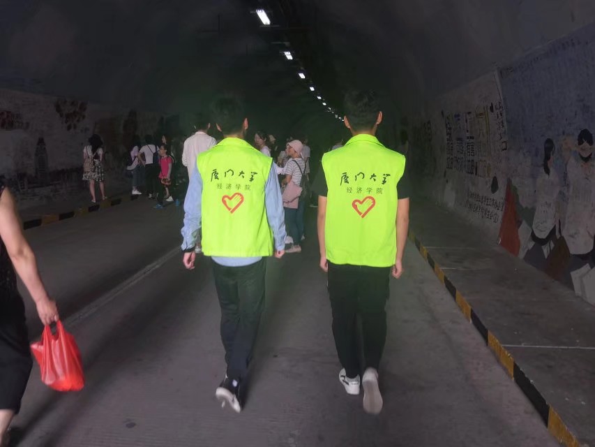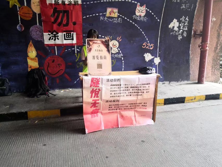 另一组志愿者是隧道巡逻志愿者,旨在阻止游客在隧道墙上涂鸦,这组志愿者在隧道中来回穿梭,他们是芙蓉隧道涂鸦的保卫军,他们是隧道文明的使者。在他们眼中“我爱你,再见”不是网红打卡点,而是千千万万毕业的学长姐对厦大的深深的爱意;“星空”之美不在于它可以拍出好看的照片,而在于它是厦大学生用心创造的美学艺术。他们将芙蓉隧道涂鸦背后的故事慢慢地讲给游客听。他们语调温柔,内心却很坚定。芙蓉隧道在清晨醒来,志愿者们向它微笑问候。夜静之时,它便安然睡去,静静地忆起白天发生的点点滴滴。