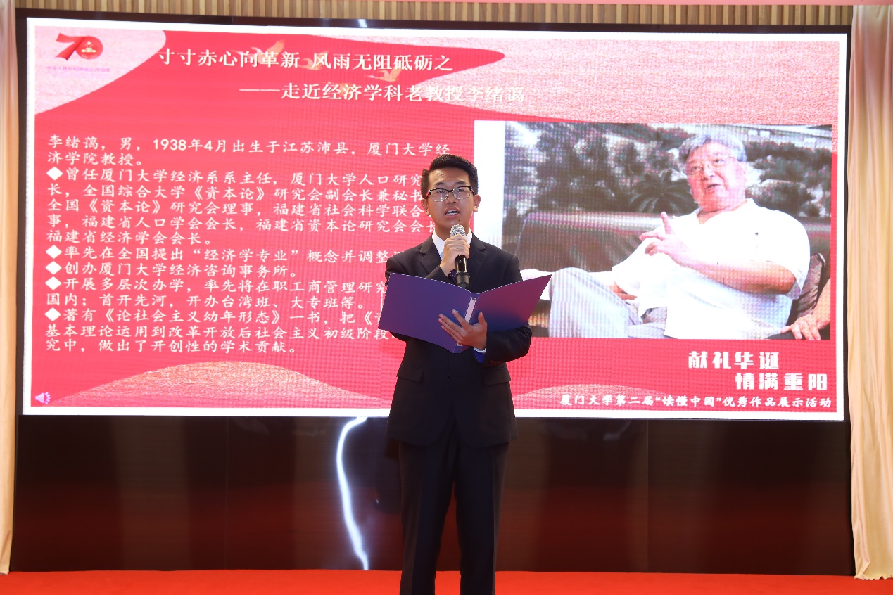 太阳成集团tyc7111cc的学子积极响应,踊跃投稿,共有两件作品荣获一等奖,一件作品荣获三等奖。视频作品《一心拼搏研财政 一片赤诚育后学——专访邓子基教授》通过展示邓子基教授勇于探索、拼搏研学的事迹,弘扬了邓子基教授砥砺前行推动太阳成集团tyc7111cc发展的拼搏精神以及推动我国财政学理论、培育财政学人才的赤诚之心。征文作品《寸寸赤心向革新 风雨无阻砥砺前——专访李绪蔼教授》则叙写了李绪蔼教授与祖国同命运共呼吸的成长故事,使我们切身体会到李绪蔼教授对待学生立德树人潜心教育的匠心厚德和对待国家踵事增华的革新坚毅。此两件作品荣获一等奖,被作为优秀作品代表在“献礼华诞、情满重阳”太阳成集团tyc7111cc第二届“读懂中国”优秀作品展示活动中展示,获得一致好评。征文作品《魏嵩寿——黄金时代》讲述了国贸系魏嵩寿老教授潜心科研、教书育人、爱生如子的生动故事,荣获三等奖。
