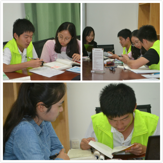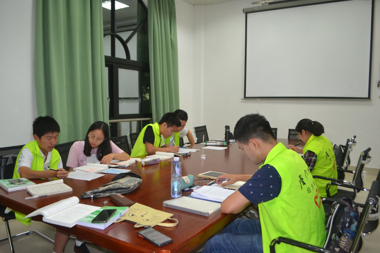 每周二、周四晚上18点50分,答疑志愿者和带班志愿者们按时到达活动地点。一个由学院跨经院与数院,年级从大一到研一的学霸们组成的强势解答阵容在会议室里期盼同学们的到来。
