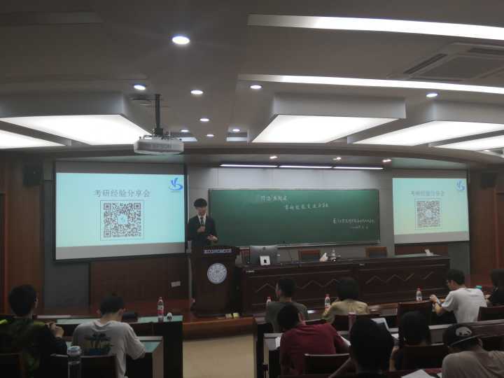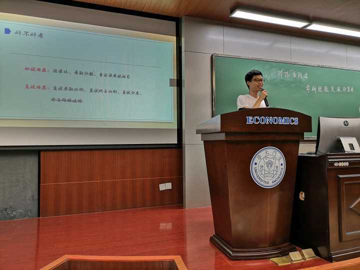 活动伊始,成功考取到上海财经大学应用统计专硕的张馨仪同学登台分享她在考研时对于初试不同科目的复习方法,推荐了在初试中对考试有利的复习资料,并对自己考研时产生的问题进行了深刻的分析。最后,她还分享了一些复习中的注意事项,要兼顾“计划”、“效率”、“适合”以及“坚持”。