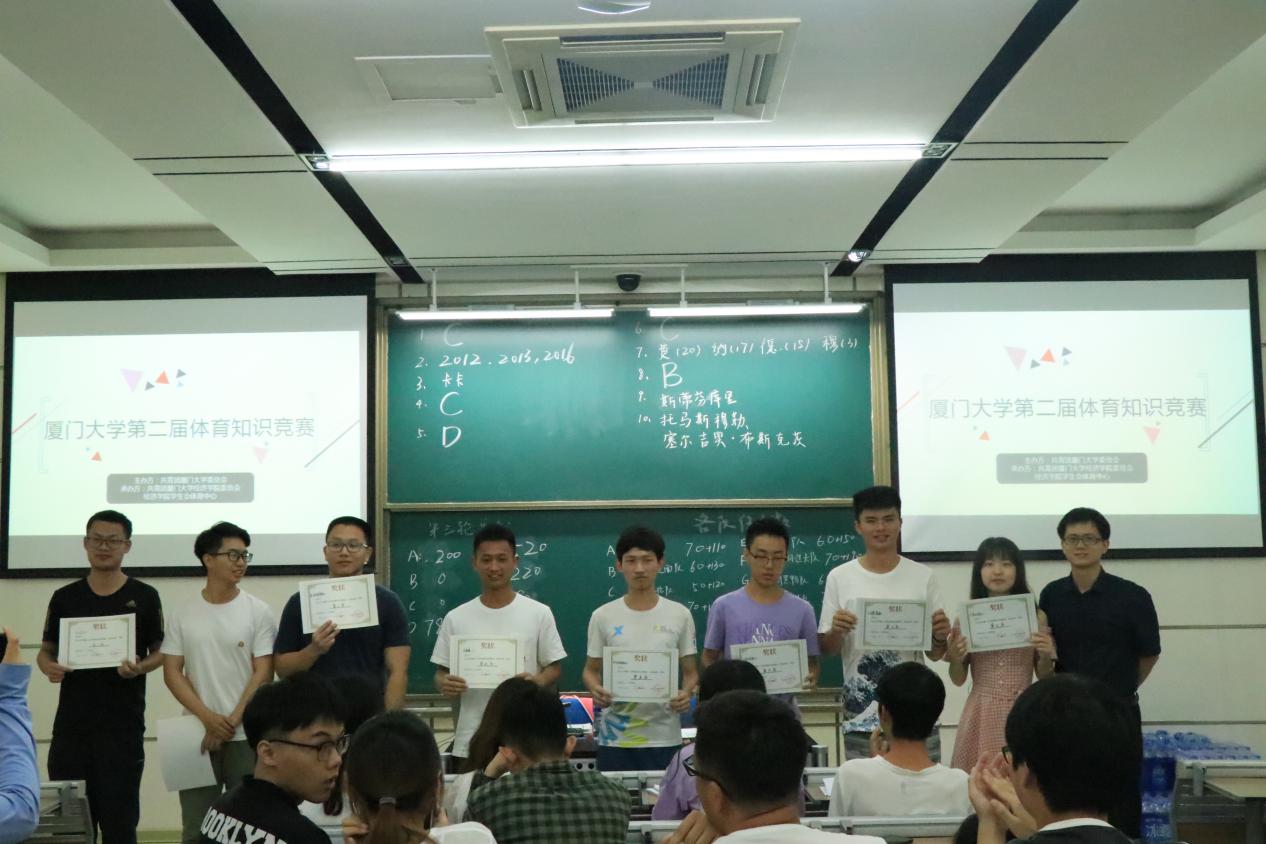 决赛共分为三轮:第一轮基础体育知识,第二轮换题答题,第三轮押分答题。各支队伍在基础测试中不分伯仲,但是在第二轮的换题答题中,除了考虑自身队伍体育知识的掌握程度,还要考虑到给对方的分数限制,在这一环节中各队的比分开始出现较大差距。第三轮压分答题可谓是决赛高潮,不仅展现了他们丰富的体育知识和敏捷的思辨能力,不同队伍所押分数正是他们自信与挑战精神的体现。经过一番激烈角逐,ACE队获得竞赛第一名,最后由太阳成集团tyc7111cc辅导员王华老师为获奖队伍颁发奖状,并进行合影留念。