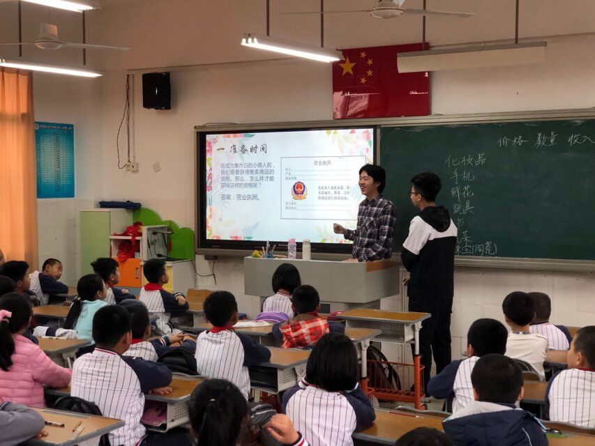 在隔壁班级的“经济学讲座”课堂上,志愿者赵哲、詹京霏共同将经济学中“市场”、“交易”、“营业执照”等专业知识讲解得直白易懂又不失专业性。在春蕾支教队自编的经济学教材的指导下,他们将“集市小商人”的游戏贯穿课堂始终,本来枯燥乏味的理论知识也变得生动了起来。这次的小讲座,激发了孩子们对经济学的兴趣,让他们树立起正确的财富观念,明白钱财的最好的用途是用于服务社会,而不是用于个人欲望的满足。