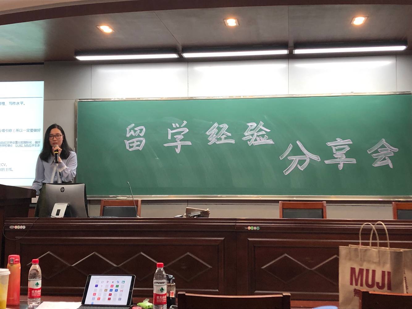 紧接着,是同为来自统计学国际化试点班的施雨同学分享经验。施雨同学以幽默风趣的语言讲述了自己独特的学习经历,尤其是她讲到如何弥补数分学习的不足、一步步提高自己成绩的这部分引起了现场同学们的共鸣,赢得了热烈的掌声。随后,她又以自己为例提到如何合理规划时间,找到合适自己的方法,以及要有不畏惧失败的勇气等方面,而这些都是申请留学的过程中的重要条件。