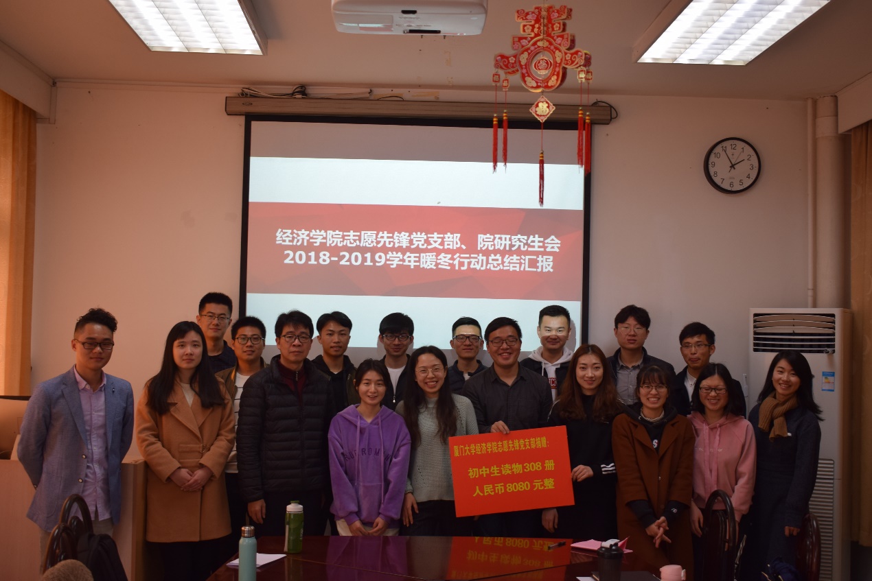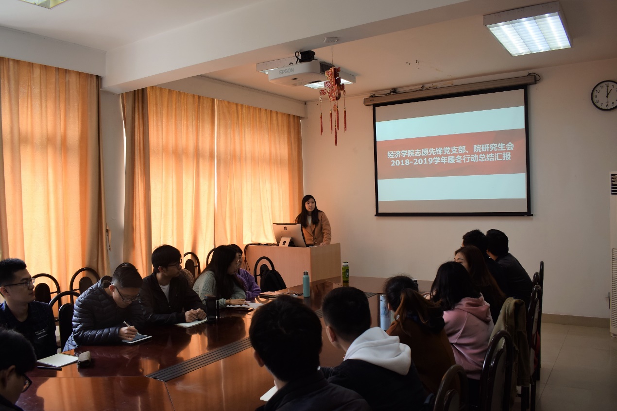 党支部书记张益辉介绍“暖冬行动”概况。“暖冬行动”是志愿先锋党支部特色活动之一,是由党支部发起、支教党员作为沟通桥梁的党支部和西部学校结对子、送温暖活动。自2010年活动创办以来,以志愿先锋党支部的名义为西部偏远地区的孩子们捐献的财物达十余万元。2018年冬,暖冬行动之“心系关桥,情暖闽宁”活动如期举办,旨在为宁夏海原关桥中学募捐建设校园图书角。