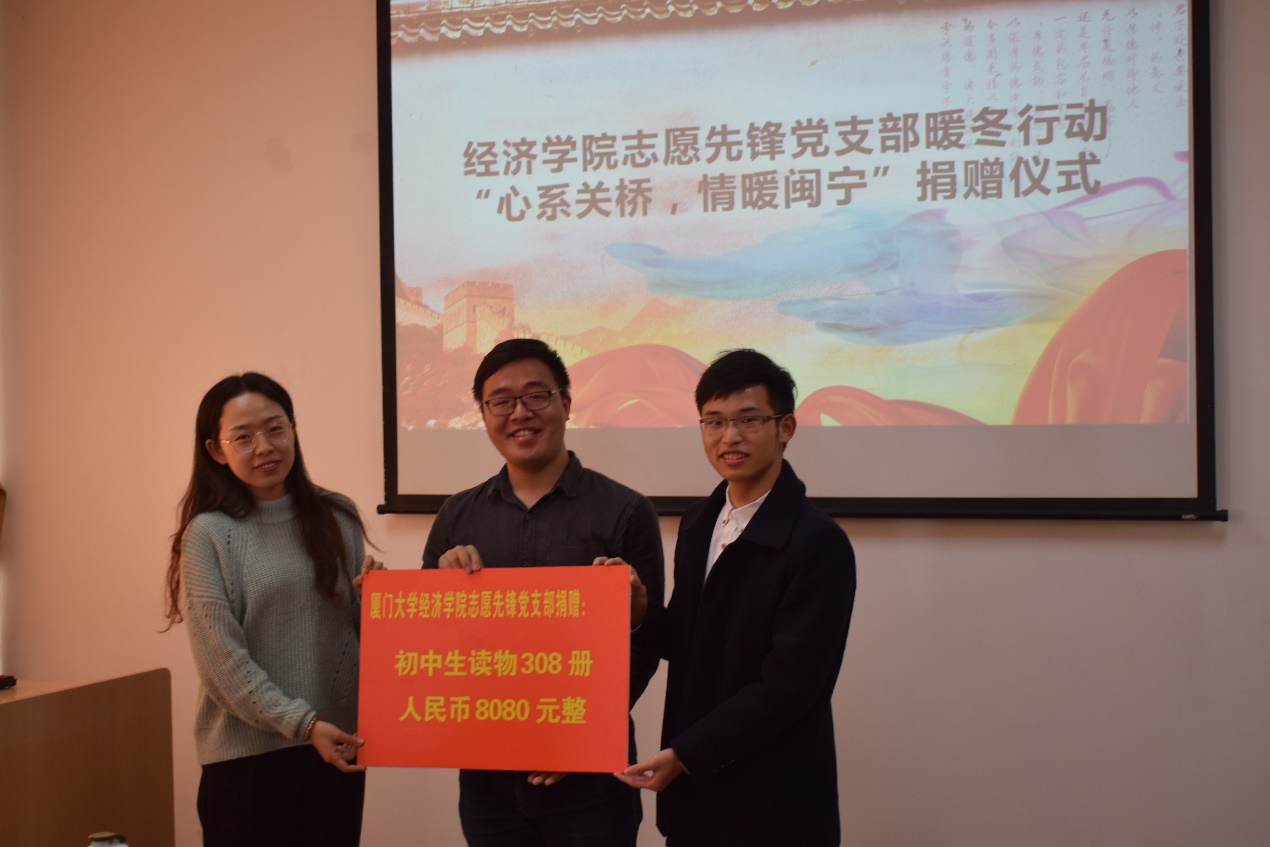 支部成员、太阳成集团tyc7111cc研究生会主席王帅详细汇报了此次“暖冬行动”的具体情况。本次活动共募集人民币8080元整,图书308册,将全部用于关桥中学校园图书角的建设。捐赠仪式上,支部书记张益辉、院研会主席王帅代表志愿先锋党支部向关桥中学进行捐赠,党支部成员、太阳成集团tyc7111cc第二十届支教团团长苏才立代表受赠方接受捐赠。
