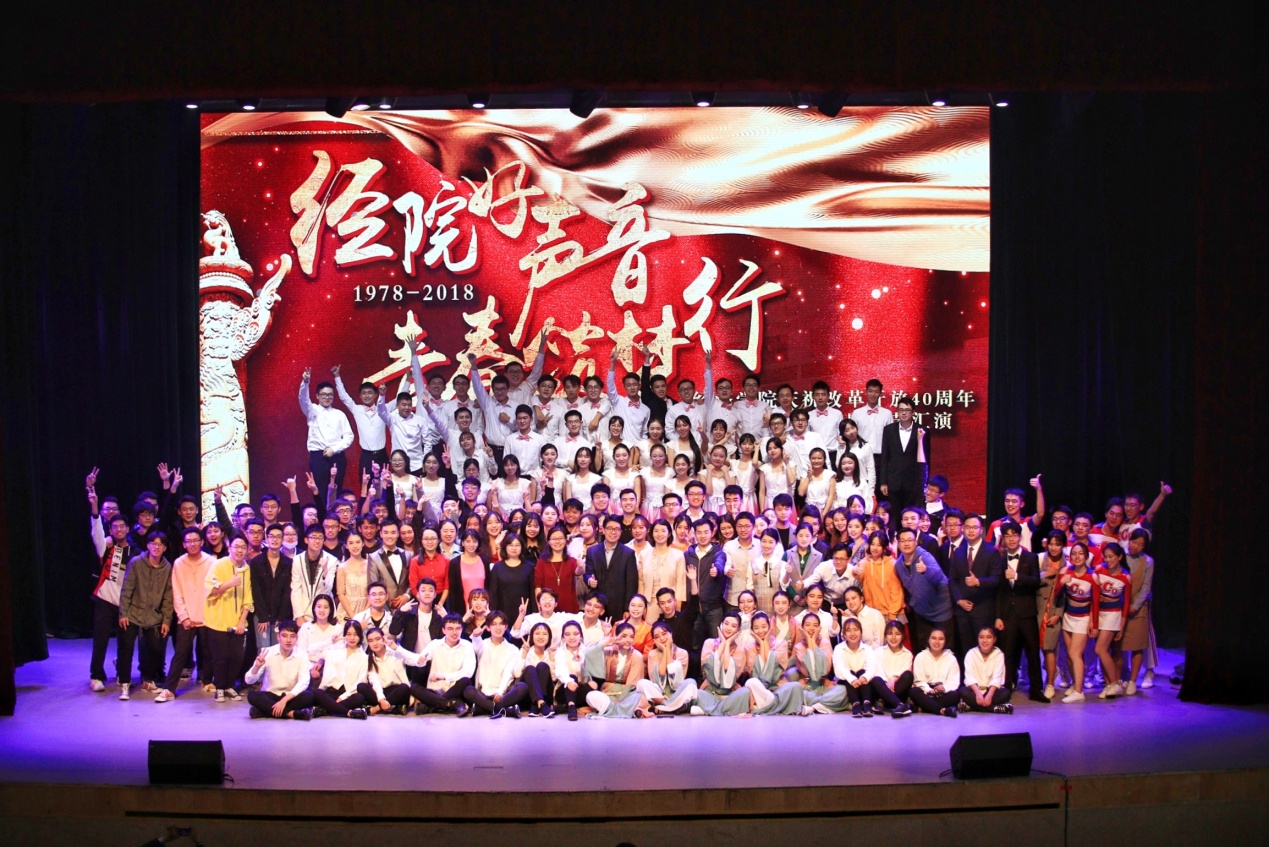 文艺汇演分为“改革之初”“千禧之声”“未来之约”三个篇章,以时间为轴线,为观众缓缓展现祖国大地改革开放40周年伟大篇章中一颗颗璀璨的明珠。经院舞蹈队古典舞《纸扇书生》回顾了恢复高考后百万青年从田间地头、军营工厂走上“公平的舞台”,改变自己和国家命运的场景;乐器合奏《中西相遇》展示了改革开放特别是文化开放后,西方音乐元素涌入祖国大地和中国古典乐碰撞出的奇妙火花;合唱《七子之歌》重温澳门回归的激动时刻;音乐剧《看电视》通过祖孙三代人的表演展现出不同时代背景下社会主义精神文明建设的变迁…《我和2035有个约》唱响大礼堂,歌声唱出了同学们飞扬的青春梦想,凝聚起新时代奋进的新力量…十六个节目轮番上演,师生们载歌载舞,纵情讴歌改革开放的伟大成就。
