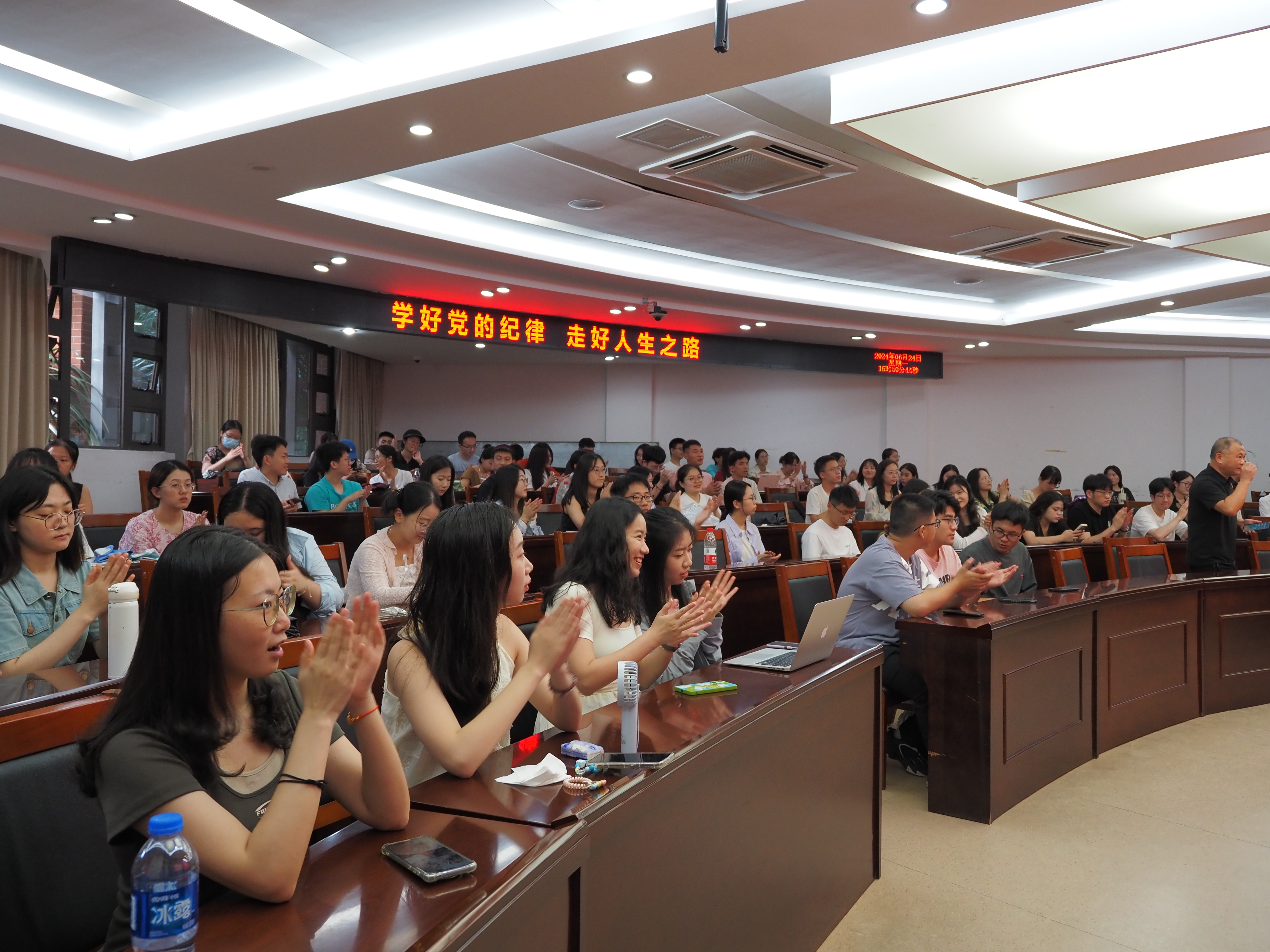 高忠华简明扼要地讲述了党的纪律的历史沿革,从中国共产党团结带领中国人民实现民族独立、人民解放的过程中严格执行党纪的故事切入,阐述纪律严明是党的光荣传统和独特优势,也是自我革命的重要保证。党的百年奋斗历程充分证明,严明的纪律和规矩,是我们党立党兴党的强大武器,保证了我们党不断从胜利走向胜利。接着,高忠华从党的政治纪律、组织纪律、廉洁纪律、群众纪律、工作纪律、生活纪律六个方面对毕业生党员们提出了具体要求,希望同学们要学好党的纪律,守住党员的底线,走好人生之路。