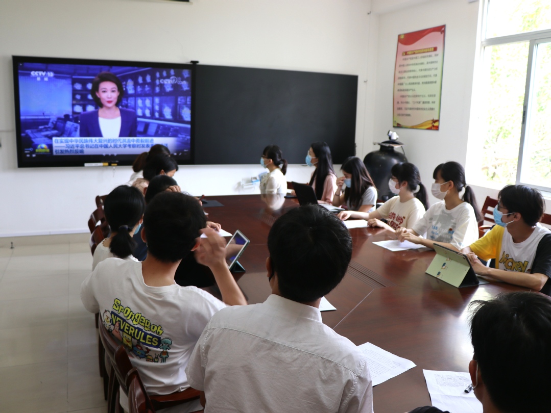 师生代表观看了习近平总书记在中国人民大学考察的新闻报道,并结合自己的学习、工作情况依次分享了学习感悟。