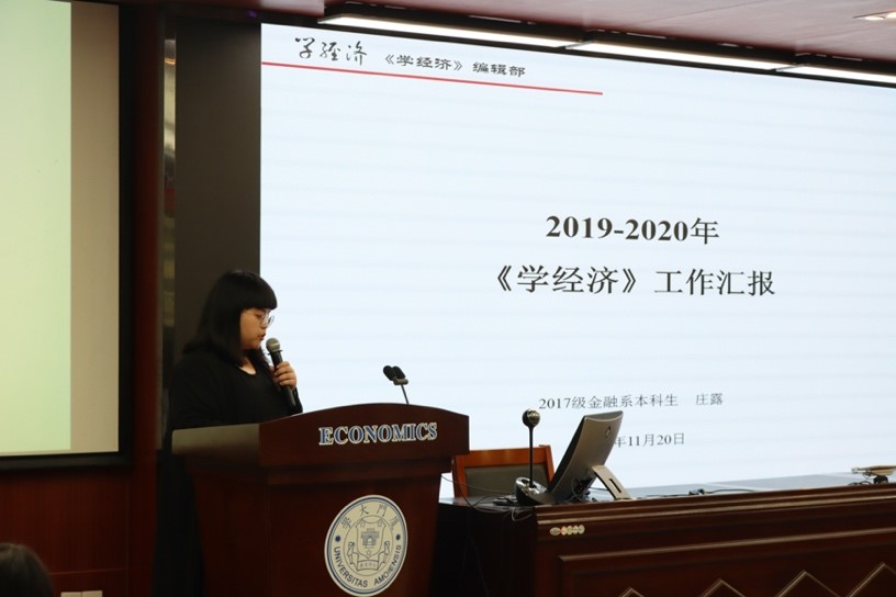 《学经济》编辑部执行主编庄露同学为大家介绍了《学经济》一年来取得的成果。这一年,《学经济》坚持思政研讨和学生培养两手抓,取得了较大的发展和进步。《学经济》公众号“经经有道”阅读量不断攀升,截止2020年11月,公众号累计阅读量近8万,与去年同期相比增长近170%。其中,十个核心子版块(厦大青年、学经济文、资本论道等)取得了同步发展。编辑部在疫情期间推出的核心系列“宅学战疫”累计发布108篇推送,累计阅读量达三万次,为公众号带来了稳步的阅读量增长。《学经济》也在不断推出新的系列,丰富推送内容,提高推送质量。工作汇报过后,黄鸿德书记为一等奖同学颁发了荣誉证书和论文修改建议。