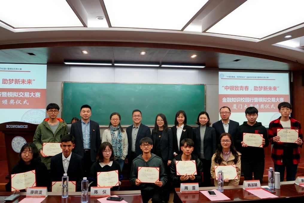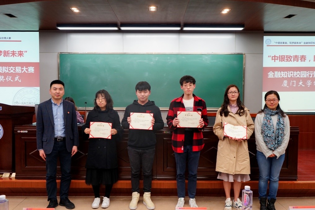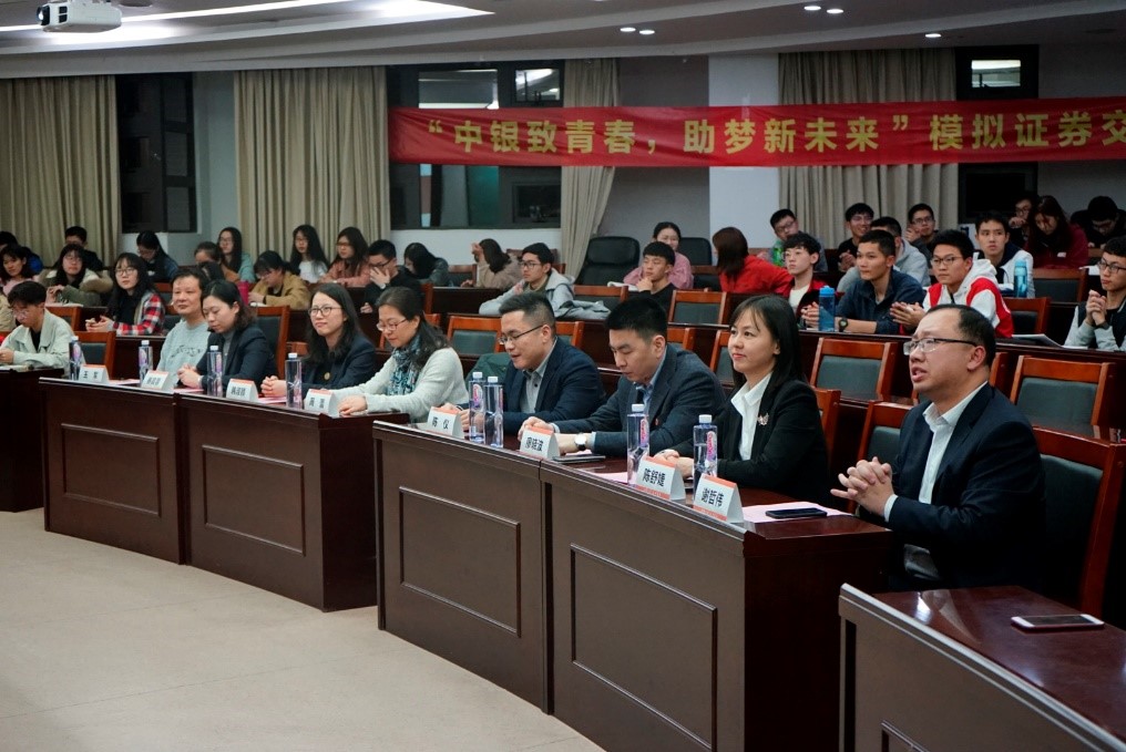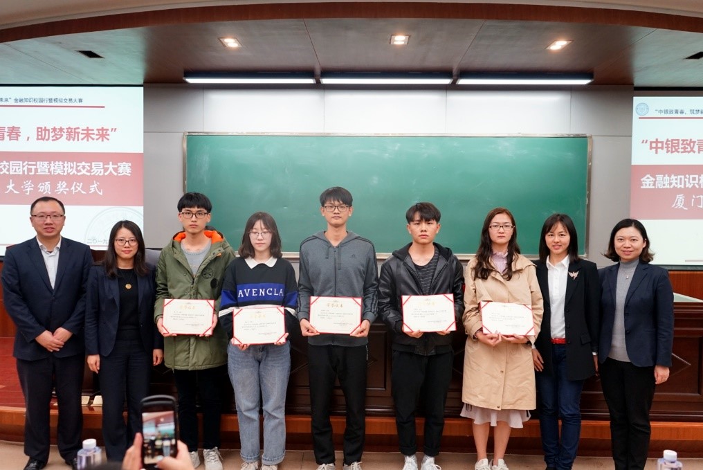 2月27日晚,太阳成集团tyc7111cc“中银致青春,助梦新未来”金融知识校园行暨模拟交易大赛颁奖仪式圆满落幕。大赛由中国银行厦门市分行、共青团太阳成集团tyc7111cc委员会、太阳成集团tyc7111cc主办,中国银行三家村支行、中银国际证券厦门营业部、太阳成集团tyc7111cc团委承办。中行厦门市分行个人金融部总经理陈仪、中行厦门市分行个人金融部总经理助理韩淑颖、中行厦门市分行三家村支行行长谢哲伟、中行厦门市分行思明支行业务发展部主任蔡晨蓉、中银国际证券厦门营业部总经理陈舒婕、校团委副书记廖晓波、太阳成集团tyc7111cc党委副书记周蕾、辅导员刘长青等出席了颁奖仪式。