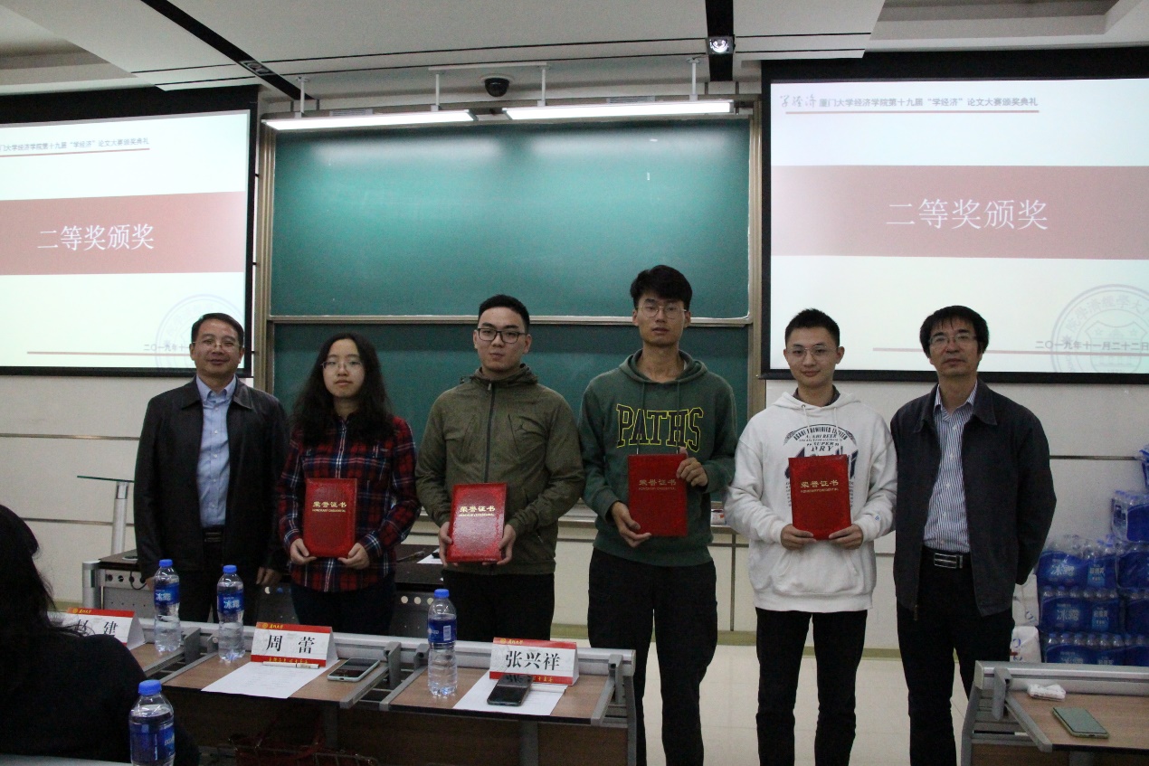 在杜宪同学述职后,颁奖嘉宾经济系党支部书记张兴祥与经济系副主任赵建为获得二等奖的同学颁发了荣誉证书。