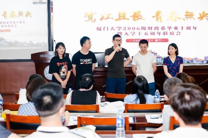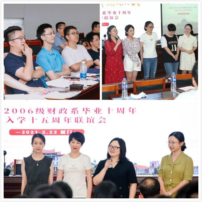 同时晚宴中还开展了带有厦大财政特色的“你来比划我来猜”、“传声筒”等游戏互动,现场评选了毕业十年“完美蜕变”和“永葆青春”大奖,设计了别致的生日祝福,揭晓了21对生日相同的同学名单,将活动推向了一个又一个高潮。