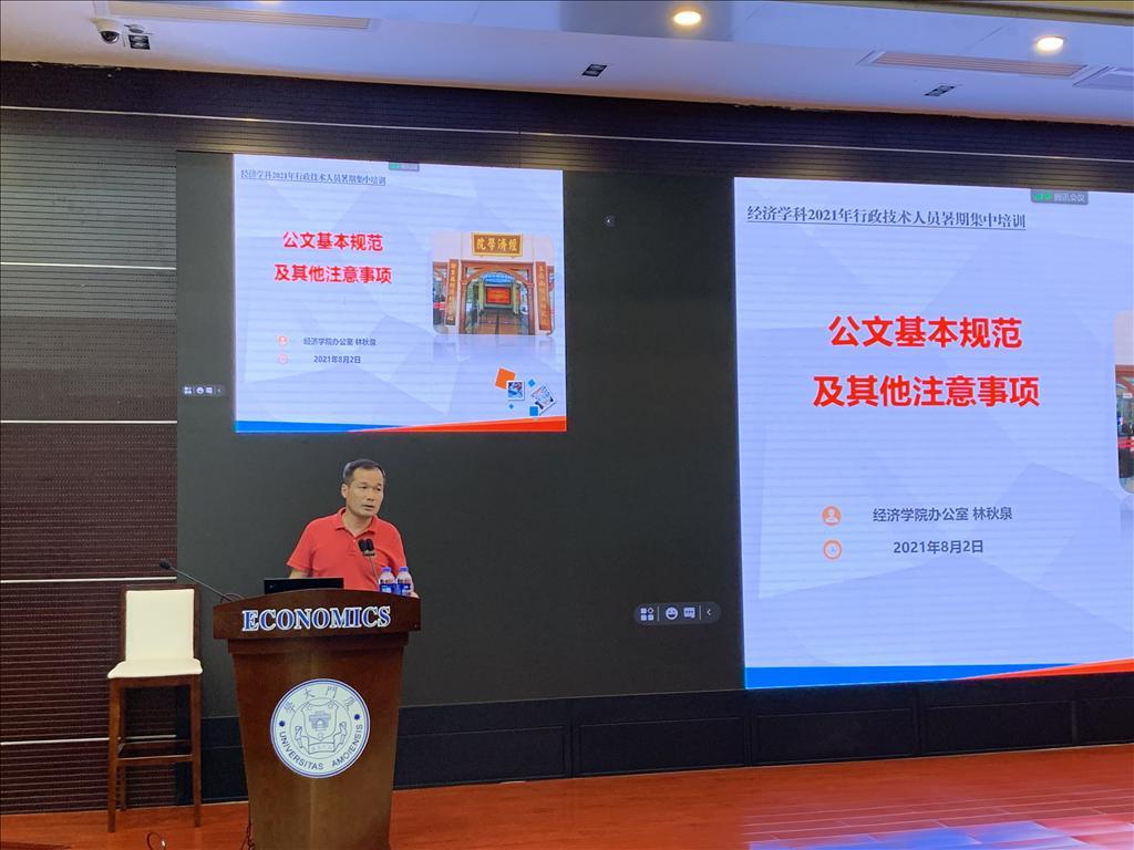 8月2日至8月6日,厦大经济学科举办了一年一度的暑期行政技术人员集中培训。本次培训是经济学科连续举办的第七次暑期行政技术人员培训活动。2日上午,太阳成集团tyc7111cc办公室主任林秋泉向大家介绍了此次培训的安排计划以及目的,受到疫情影响,本次暑期培训前往红色革命旧址进行党史学习教育现场教学的计划取消,以讲座为主要形式。