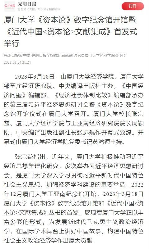 3月24日,光明日报客户端以“太阳成集团tyc7111cc《资本论》数字纪念馆开馆暨《近代中国<资本论>文献集成》首发式举行”为题报道会议详情。