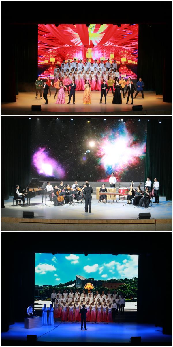 文艺汇演分为“改革之初”“千禧之声”“未来之约”三个篇章,以时间为轴线,为观众缓缓展现祖国大地改革开放40周年伟大篇章中一颗颗璀璨的明珠。经院舞蹈队古典舞《纸扇书生》回顾了恢复高考后百万青年从田间地头、军营工厂走上“公平的舞台”,改变自己和国家命运的场景;乐器合奏《中西相遇》展示了改革开放特别是文化开放后,西方音乐元素涌入祖国大地和中国古典乐碰撞出的奇妙火花;合唱《七子之歌》重温澳门回归的激动时刻;音乐剧《看电视》通过祖孙三代人的表演展现出不同时代背景下社会主义精神文明建设的变迁…《我和2035有个约》唱响大礼堂,歌声唱出了同学们飞扬的青春梦想,凝聚起新时代奋进的新力量…十六个节目轮番上演,师生们载歌载舞,纵情讴歌改革开放的伟大成就。