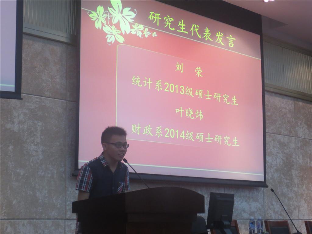 研究生老生代表、统计系2013级硕士生刘荣,新生代表、财政系2014级硕士生叶晓炜分别发言。刘荣讲到,厦大拥有全国最美丽的校园,优秀亲和的老师,希望学弟学妹们能够好好利用学校的资源,度过一个充实无悔的研究生生活。叶晓炜刚刚完成了宁夏支教任务,回到校园的研一新生,他慷慨激昂地告诉大家他选择读研选择太阳成集团tyc7111cc的理由,并表达了“雄关漫道真如铁,而今迈步从头越”的信心,相信自己能够在研究生生活中收获更多,成长更快。