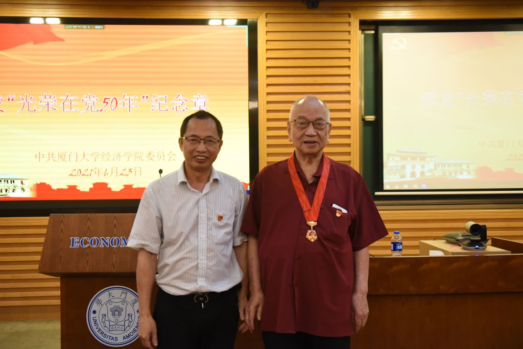 黄鸿德强调,党中央决定今年首次颁发“光荣在党50年”纪念章,这对增强党员的荣誉感、归属感、使命感,汇聚全党持续奋斗的磅礴力量,具有十分重要的意义。张亦春教授把最美好的年华都奉献给了金融学教育教学改革和金融人才教育事业,用实际行动诠释了一个共产党员的使命与担当。希望青年师生党员对标老党员的崇高境界和务实作风,赓续光荣传统,传承奋斗精神,汲取奋进力量,在致敬和传承中牢记初心使命,为推动经济学科高质量发展贡献注入新的力量。
