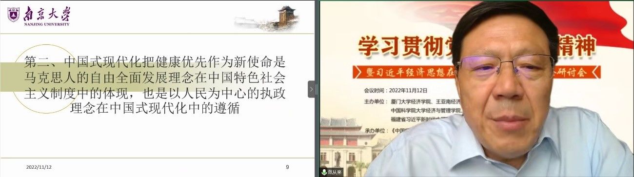 随后,教育部人文社会科学重点研究基地南京大学长江三角洲经济社会发展研究中心主任、国务院学位委员会理论经济学学科评议组成员范从来教授,中国科学院大学经济与管理学院院长、发展中国家科学院院士、《计量经济学报》联合主编洪永淼教授分别带来题为“中国式现代化的新使命:健康中国”和“中国式现代化的政治经济学意义”的主旨演讲。