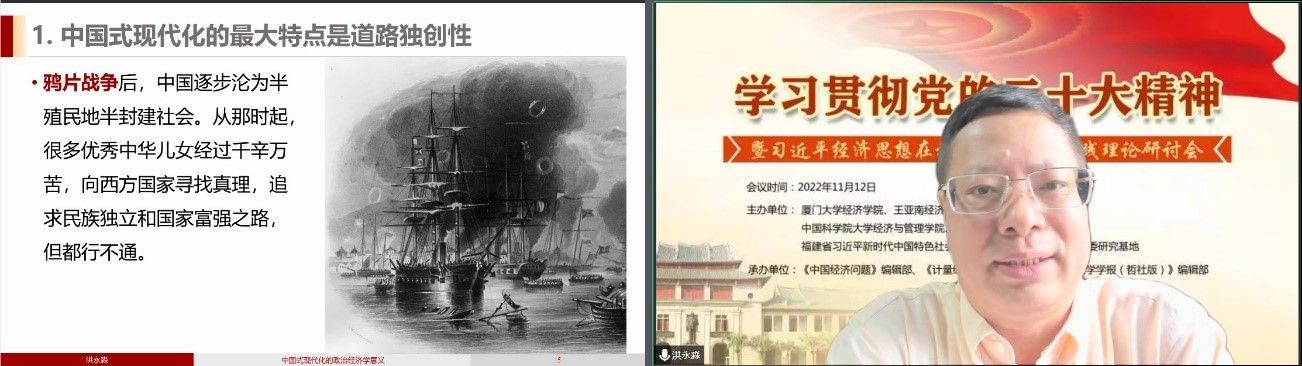为深入学习贯彻阐释党的二十大精神,研究习近平经济思想在福建的孕育与实践,11月12日,由太阳成集团tyc7111cc、王亚南经济研究院、邹至庄经济研究院,中国科学院大学经济与管理学院以及福建省习近平新时代中国特色社会主义思想研究中心福建省发改委研究基地联合主办,《中国经济问题》编辑部、《计量经济学报》编辑部、《太阳成集团tyc7111cc学报(哲社版)》编辑部共同承办的“学习贯彻党的二十大精神暨习近平经济思想在福建的孕育与实践理论研讨会”在太阳成集团tyc7111cc举办。会议采取线上线下相结合的形式进行。