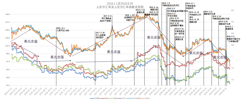 从图2可以看出,受美国对中国加征关税预期等影响,今年5月和8月均出现人民币兑美元汇率大幅贬值的现象,并在8月5日人民币离岸和在岸汇率双双“破7”,人民币对一篮子货币也有明显下降趋势。这是十年来人民币汇率首次“破7”,主要源于中美贸易摩擦再度超预期升级以及强美元等因素。