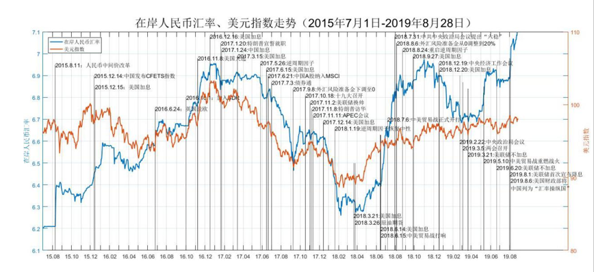今年5月以来,中美贸易战火重燃并持续升级。5月6日,美国总统特朗普在推特上发文宣布,美国将于5月10日对第二批2000亿美元自华进口货物额外加征关税税率从10%提升到25%。尽管6月29日中美元首会晤重启经贸谈判,8月1日特朗普宣称将于9月1日起对华剩余3000亿美元商品加征10%关税,引发市场对谈判前景不乐观的预期,促使本次人民币汇率“破7”。8月6日,中国商务部发表消息称,中国相关企业暂停新的美国农产品采购。2019年8月15日,美国政府宣布,对自华进口的约3000亿美元商品加征10%关税,分两批自2019年9月1日、12月15日起实施。针对美方上述措施,8月23日,中国国务院关税税则委员会决定,对原产于美国的5078个税目、约750亿美元商品,加征10%、5%不等关税,分两批自2019年9月1日、12月15日起实施。同日,特朗普在推特发布美国将在10月1日将2500亿美元中国商品的现有关税从25%提高至30%,并且原定于9月1日生效的另外3000亿美元中国商品的关税将从10%升至15%。中美经贸摩擦的不断升级是影响短期人民币汇率波动的主因。