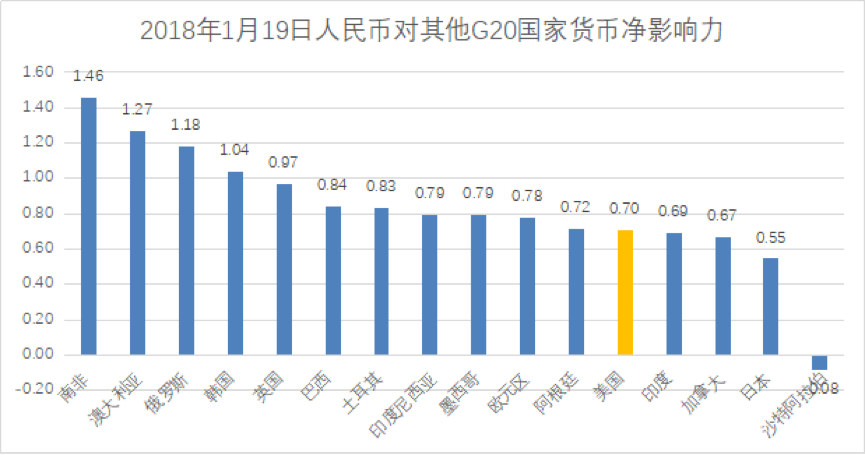 图4和图5分别为2018年1月19日和2018年7月10日人民币对G20国家中各国货币净影响力,从图中可以看出,人民币汇率对G20经济体各种货币的影响均有所下跌,其中人民币对美元的净影响力从0.70下降至0.60,降幅达14.28%。
