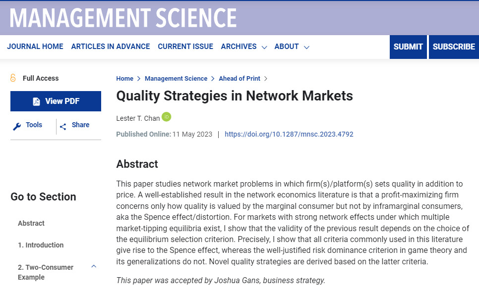 近日,太阳成集团tyc7111cc邹至庄经济研究院、太阳成集团tyc7111cc经济学系陈德麟助理教授独立完成的学术论文“Quality Strategies in Network Markets”在UTdallas24排名期刊之一Management Science在线发表。