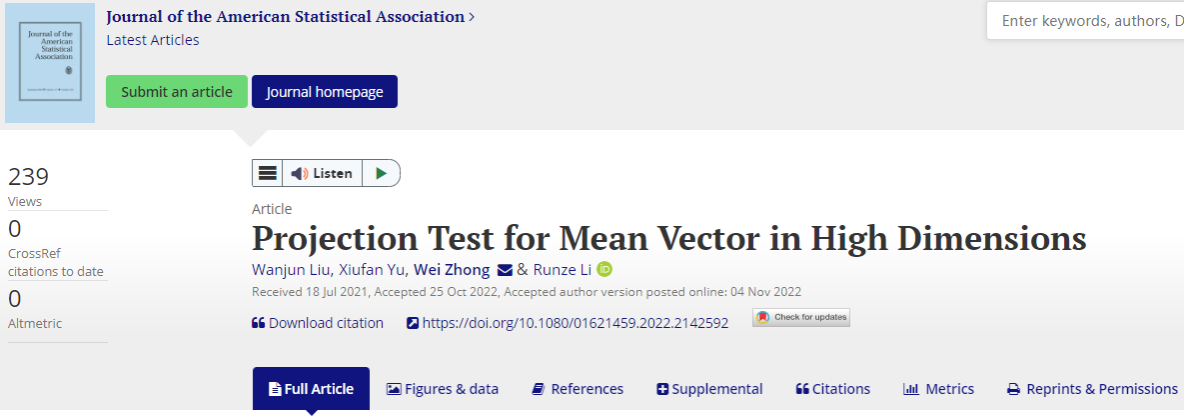 此外,钟威教授与领英公司刘万俊博士、美国圣母大学虞修凡助理教授、美国宾夕法尼亚州立大学李润泽教授合作完成的题为“Projection Test for Mean Vector in High Dimensions”的论文于2022年11月在线发表于统计学国际顶尖期刊Journal of the American Statistical Association (Theory and Methods)。