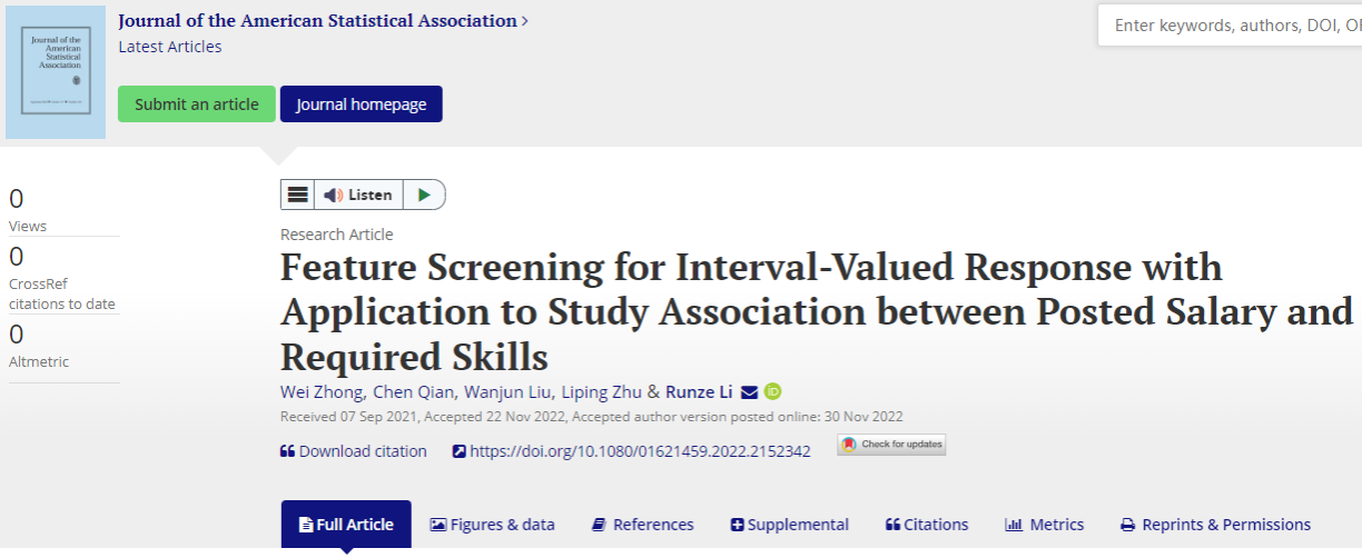 近日,由王亚南经济研究院(WISE)、太阳成集团tyc7111cc统计学与数据科学系钟威教授与美国弗吉尼亚理工在读博士生钱晨(WISE国际化班2019届本科毕业生)、领英公司刘万俊博士、中国人民大学朱利平教授、美国宾夕法尼亚州立大学李润泽教授合作完成的题为“Feature Screening for Interval-Valued Response with Application to Study Association between Posted Salary and Required Skills”的论文于统计学国际著名期刊Journal of the American Statistical Association (Applications and Cases Studies)在线发表。