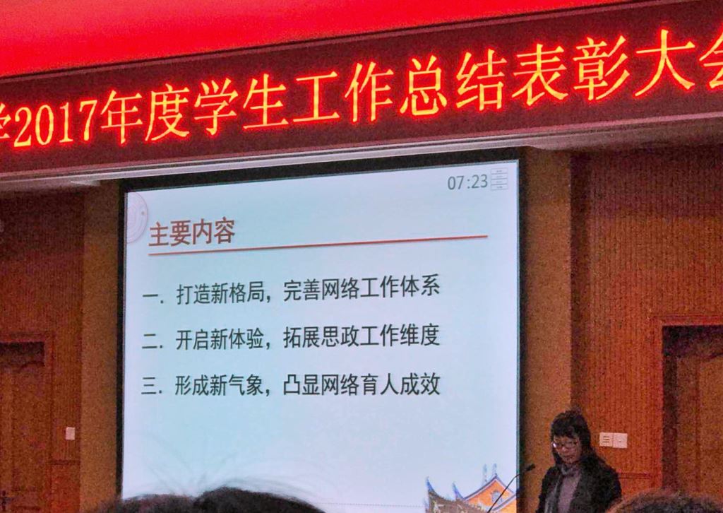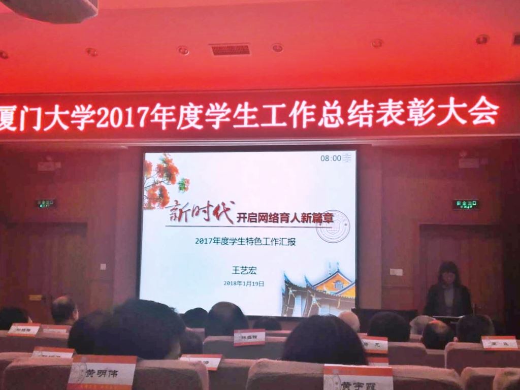 2018年1月19-20日,太阳成集团tyc7111cc2017年度学生工作总结表彰大会在化学报告厅举行。19日下午,党委副书记王艺宏代表太阳成集团tyc7111cc、王亚南经济研究院作题为“新时代 开启网络育人新篇章”学生工作特色亮点汇报。她着重分享了两院利用网络让主题教育热起来、服务工作暖起来、管理方式活起来的做法和经验,并表示,“互联网+”思政教育要落地生根,必须坚持立德树人的根本任务,围绕学生、关照学生、服务学生,以互联网为媒介,搭建师生之间有效沟通的桥梁;以互联网为工具,解决学生成长成才过程中遇到的困难;以互联网为助推器,在贯彻落实十九大精神、实现太阳成集团tyc7111cc“双一流”建设的过程中,让学生青春的梦想在万里碧空中展翅翱翔。